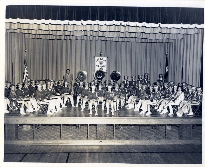 Black and white photograph of the Lake Jackson Junior High School band sitting on stage. Grant Scoggins is standing in rear. Similar to 2003.12.15.