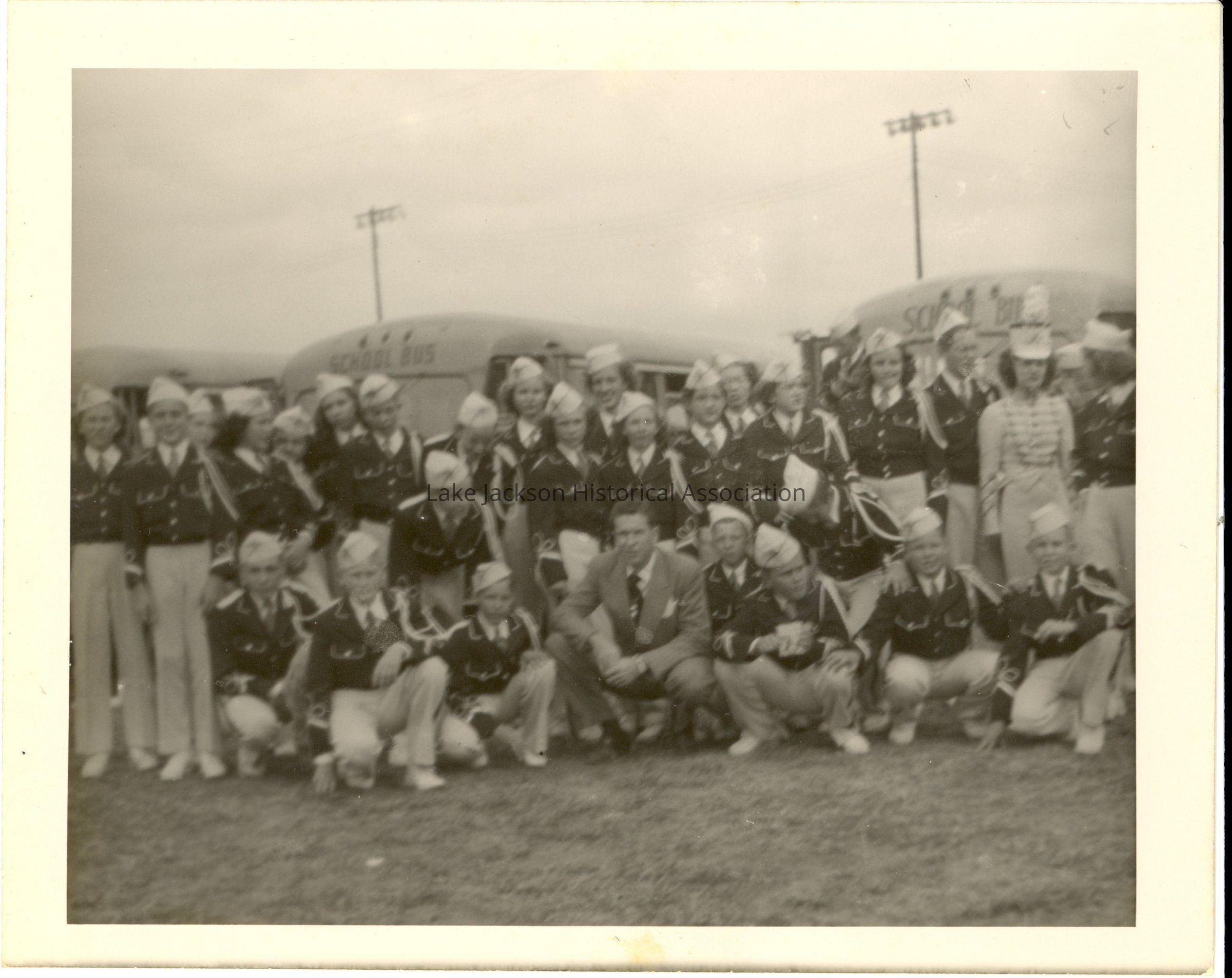 Black and picture of band in front of school busses. Front row is squatting down. Others are standing. Picture is not in sharp focus. Grant Scoggins is in front row.Collection