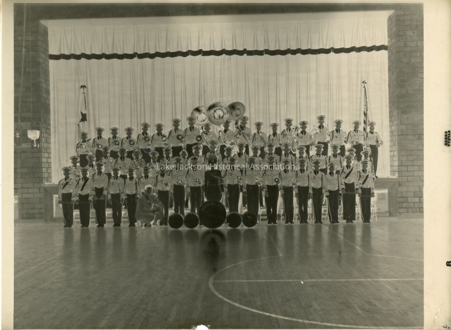 Black and white photo of the Lake Jackson Junior High Band standing on and in front of the stage.Collection