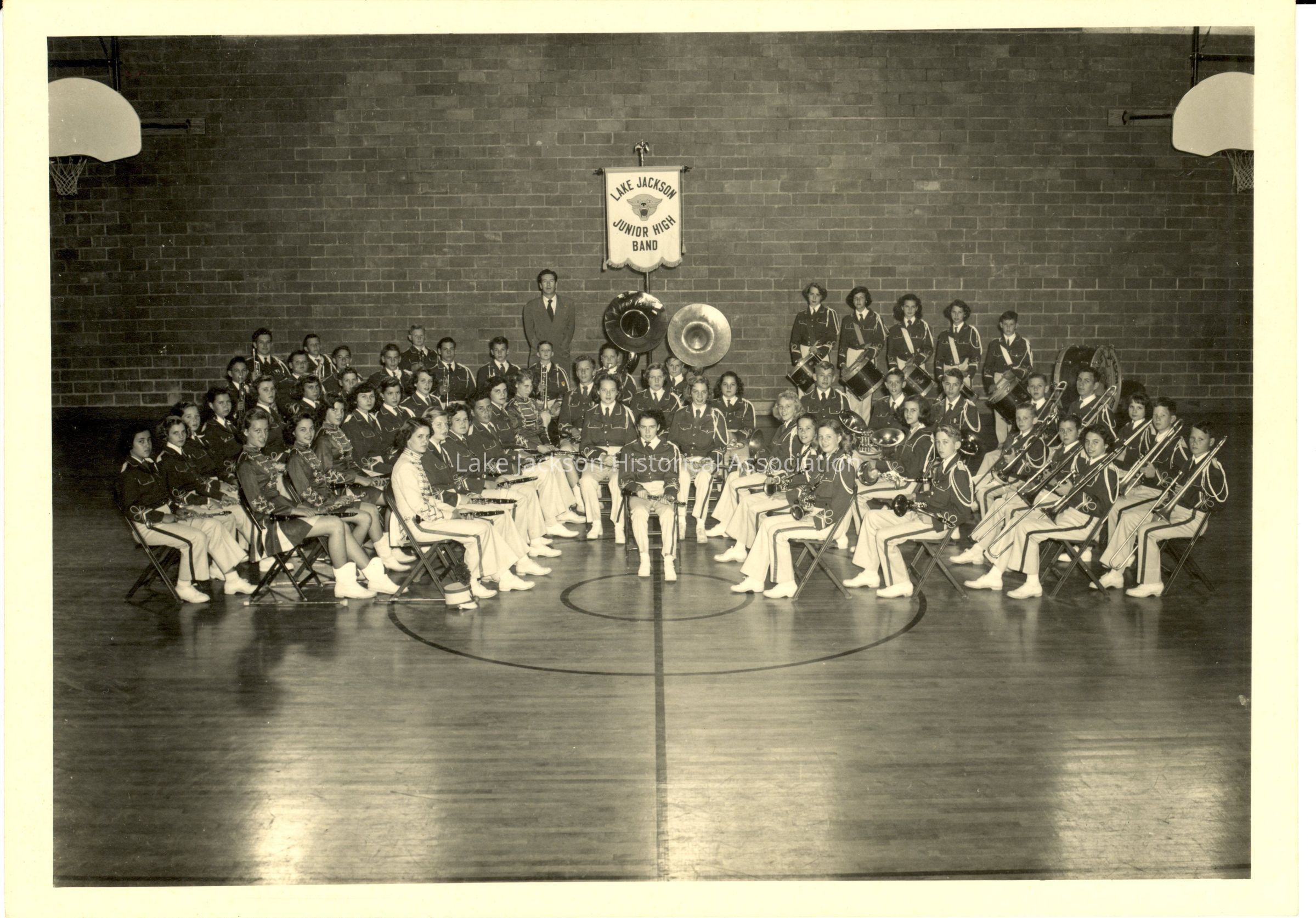 Black and white photo of Lake Jackson Intermediate School Band seated in the gym.Collection