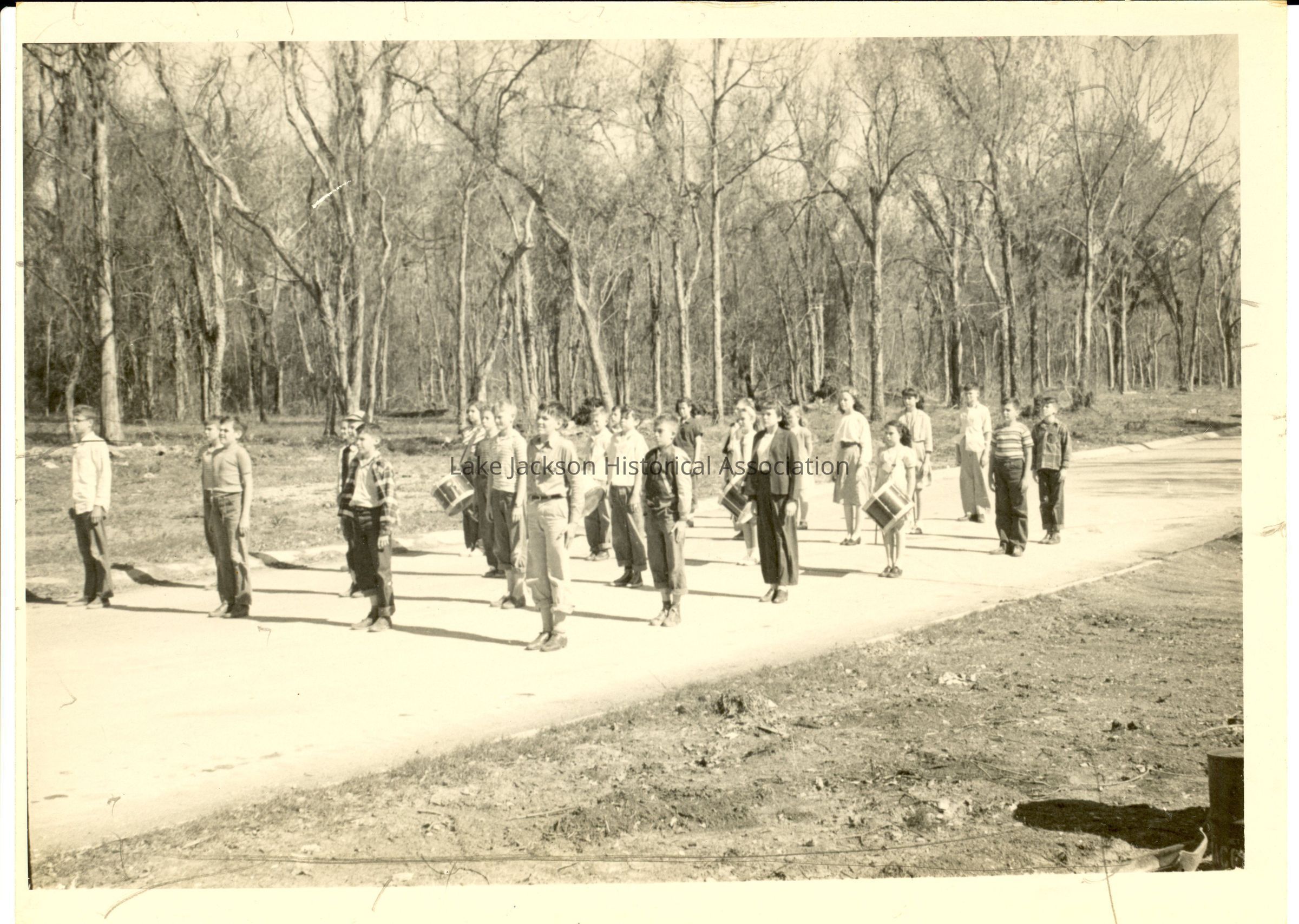 Black and white photo of Lake Jackson Intermediate School Band standing on the street.Collection