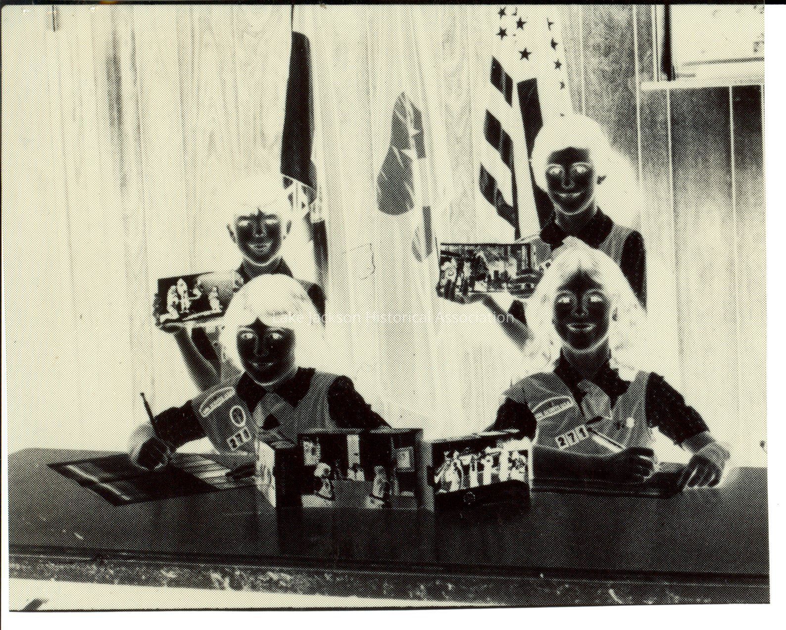 Negative of Girl Scouts with cookies to sell