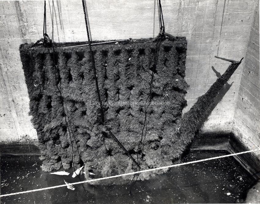 Black and white photograph of seawater intake screens. Shows a grid-like frame with fuzzy growth on it. Dead fish are visible in the lower right.