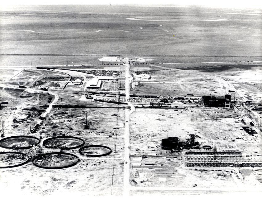 Black and white aerial picture showing Dow Chemical Plant A under construction. Appears to be facing in a westerly direction. The lower left shows five ponds or tanks under construction. The center right is a completed building, possibly a power plant. Below that is a building under construction.Collection