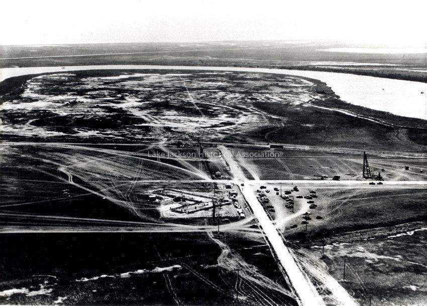 Black and white aerial picture showing the undeveloped site for Dow Chemical, Plant A. There are some roads and cars in the foreground. A structure being built is shown at the left center.Collection