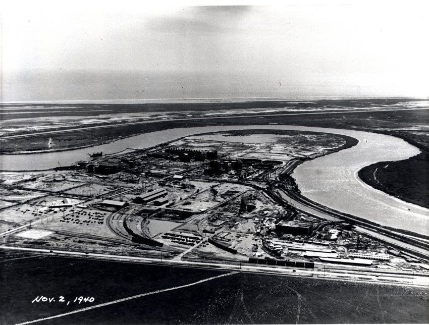 Black and white aerial picture showing Dow Chemical Plant A under construction. On the photograph is the date "Nov. 2, 1940".Collection