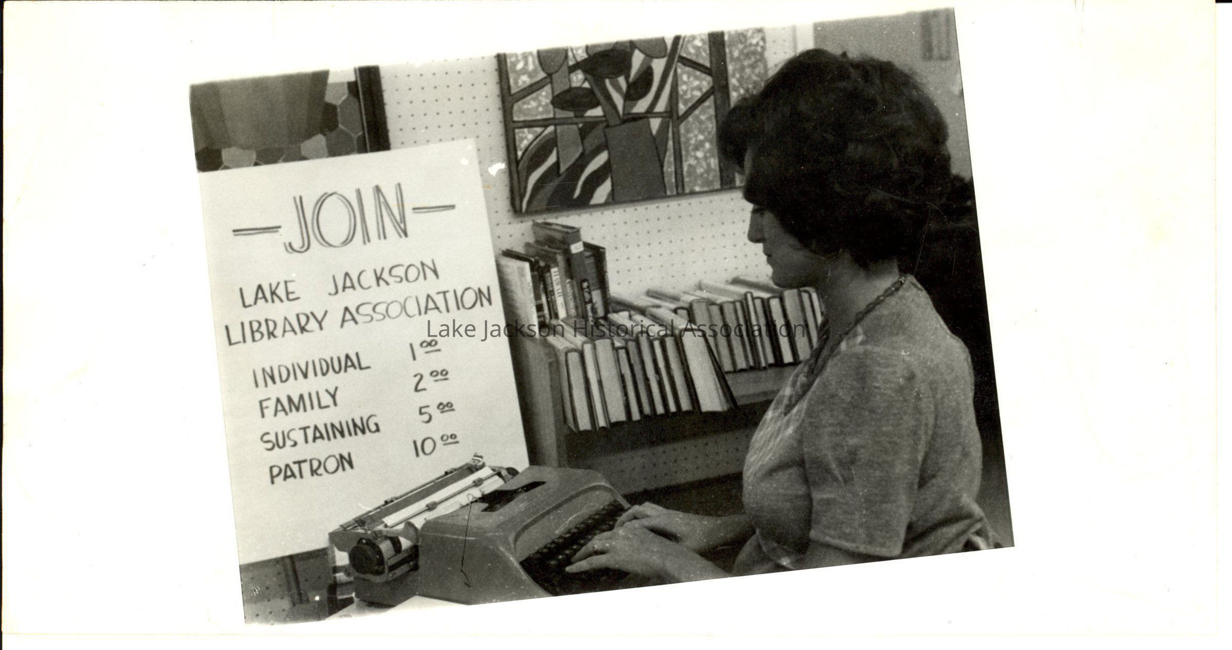 A black and white photograph of a lady, possibly Mrs. George Franklin, typing on a typewriter. Behind the typewriter is a board with "JOIN/ Lake Jackson/ Library Association/ Individual 1.00/ Family 2.00/ Sustaining 5.00/ Patron 10.00". In the background are some books on a book cart. On the back of the photograph, written in pencil, is "Mrs. George Franklin" and, in blue ink, is "Membership Drive".Collection