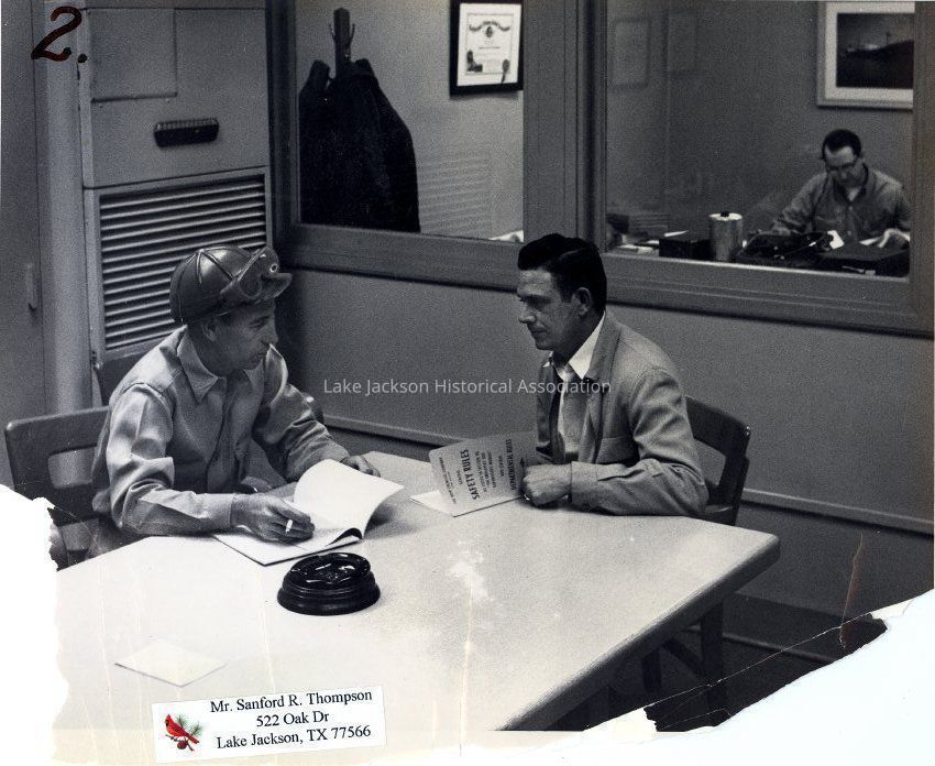 Black and white photograph showing two men sitting at a table reviewing a book entitled "Safety Rules". The man on the left is wearing a hard hat and holding a cigarette. The man on the right is holding open a copy of the "Safety Rules" book.