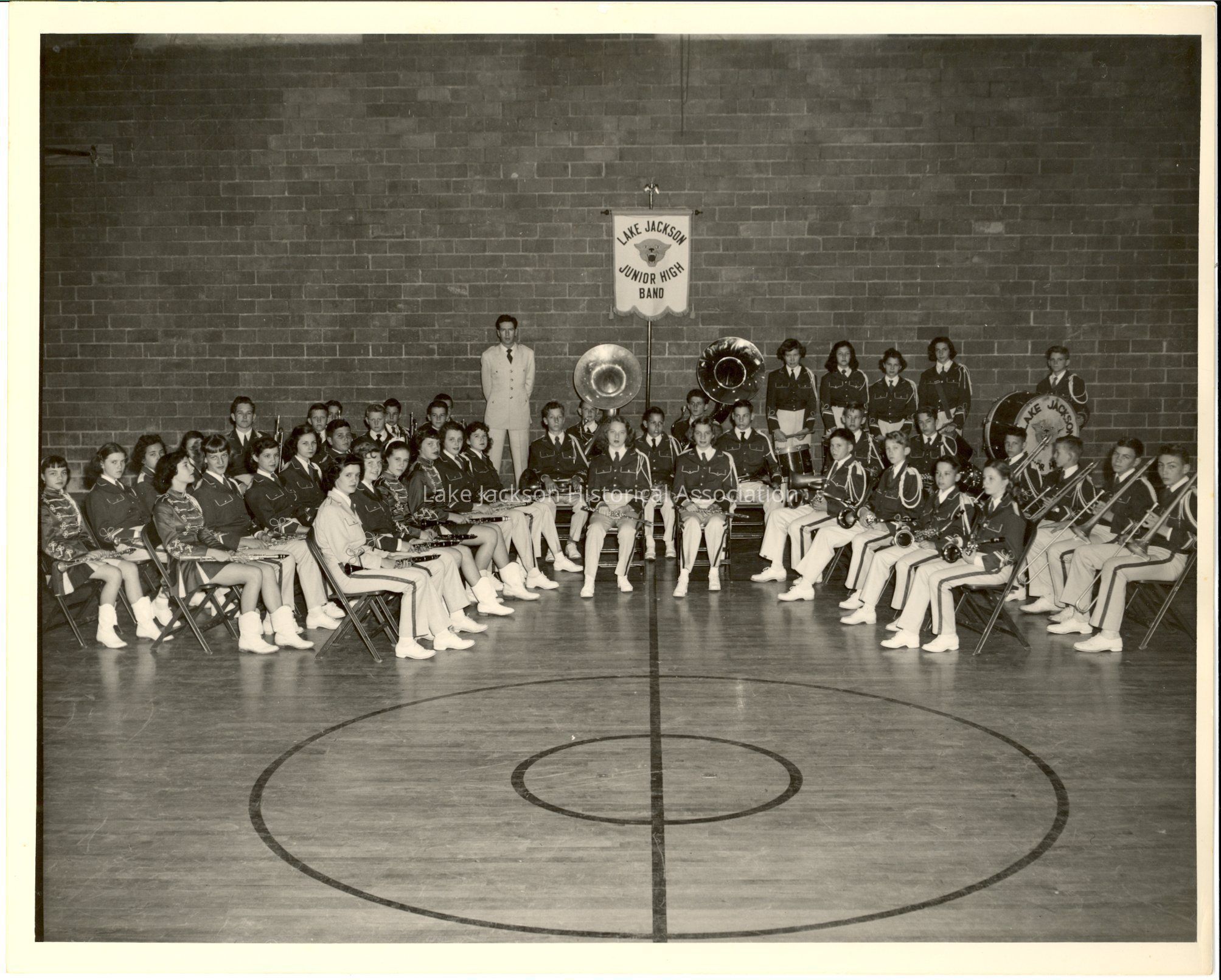 Black and white photograph of Lake Jackson Junior High School band posed in uniforms in a gym.