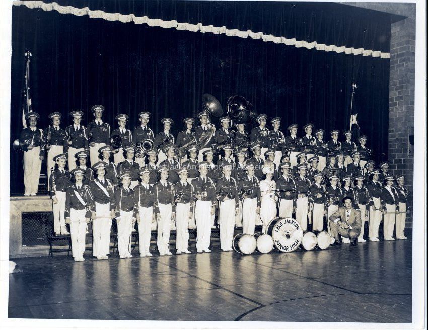 Black and white photograph of the Lake Jackson Junior High School band standing in a gym next to a stage. Grant Scoggins is kneeling in front.