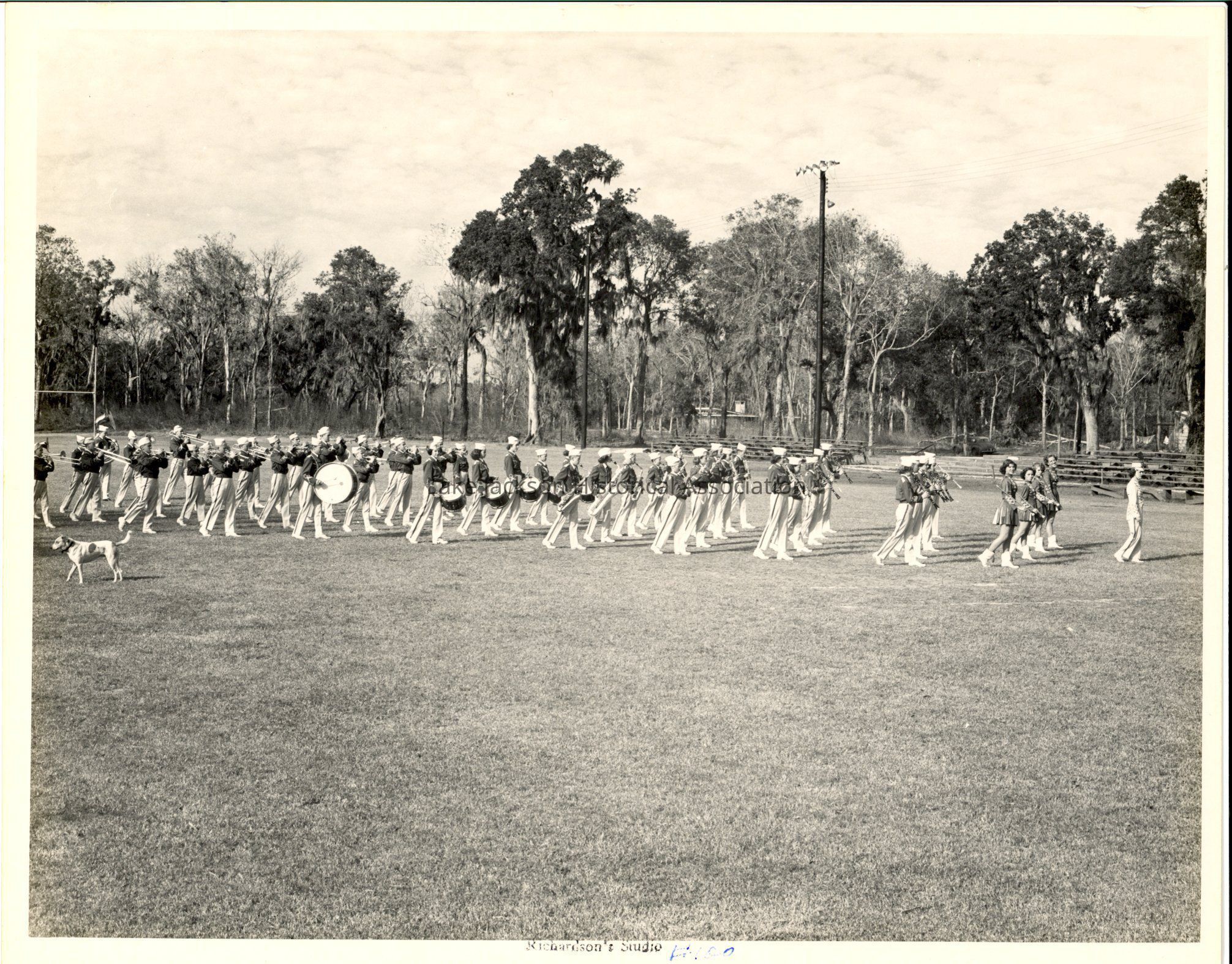 Black and white photograph of the Lake Jackson Junior High School band marching on the field in uniform.