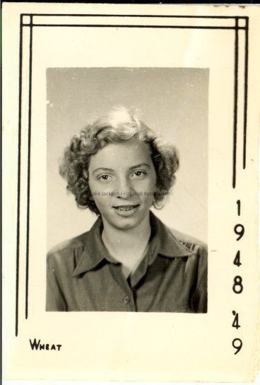 Black and white school picture of Glenda Harris. Identification is from an enclosed list. At the lower left is "Wheat". Along the lower part of the right margin is printed vertically "1948 '49". A line border surrounds the picture.Collection