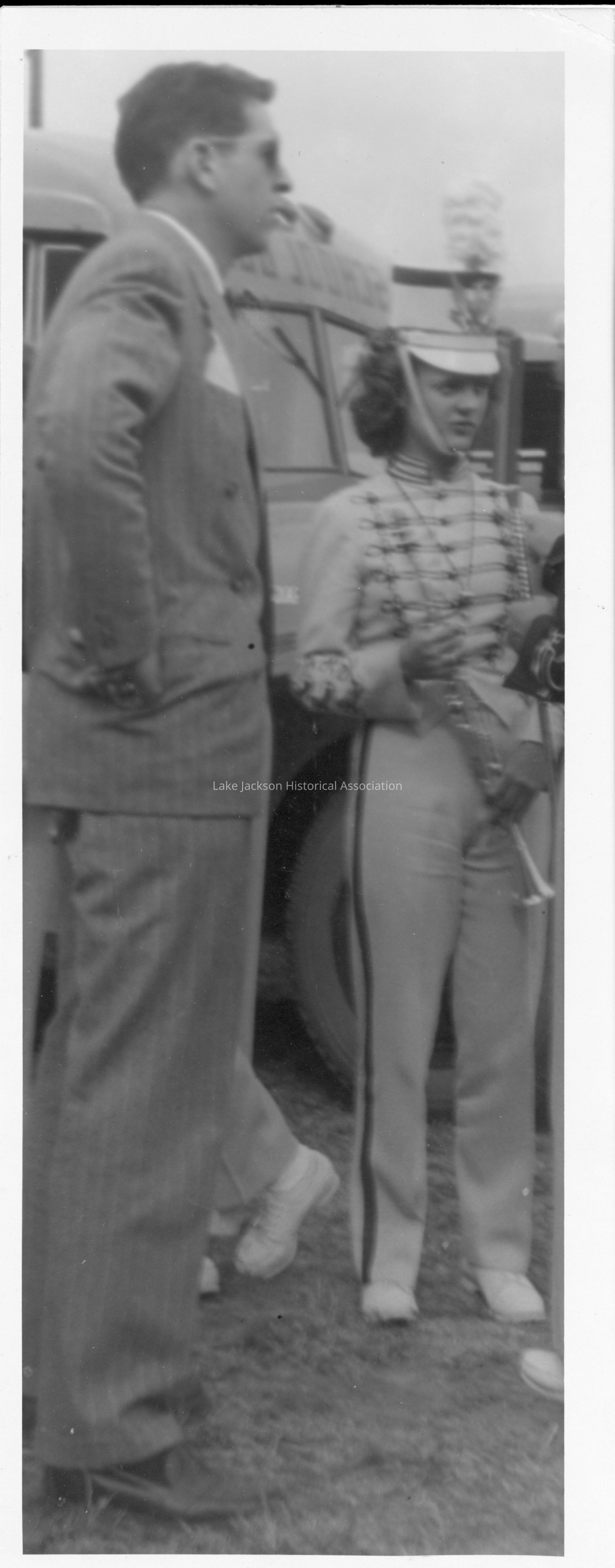 Black and White photo of Grant Scoggins in a suit with sunglasses next to a female band member who is holding a horn, standing in front of a school bus.Collection