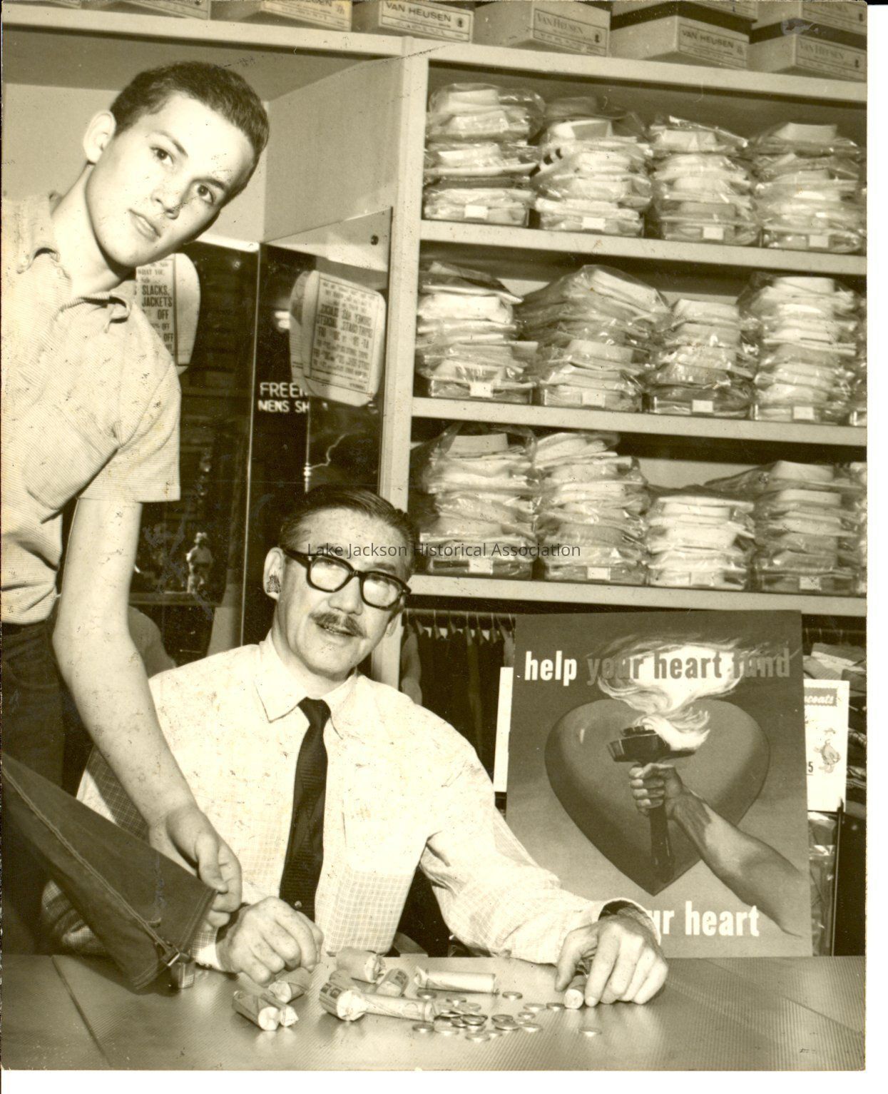 Black and white photo of a man, Mr. Croney, counting out money. A young man, Bob Walker, is standing beside him, and there is a poster about the heart fund in background. Also in the background are shelves with mens shirts on them.Collection