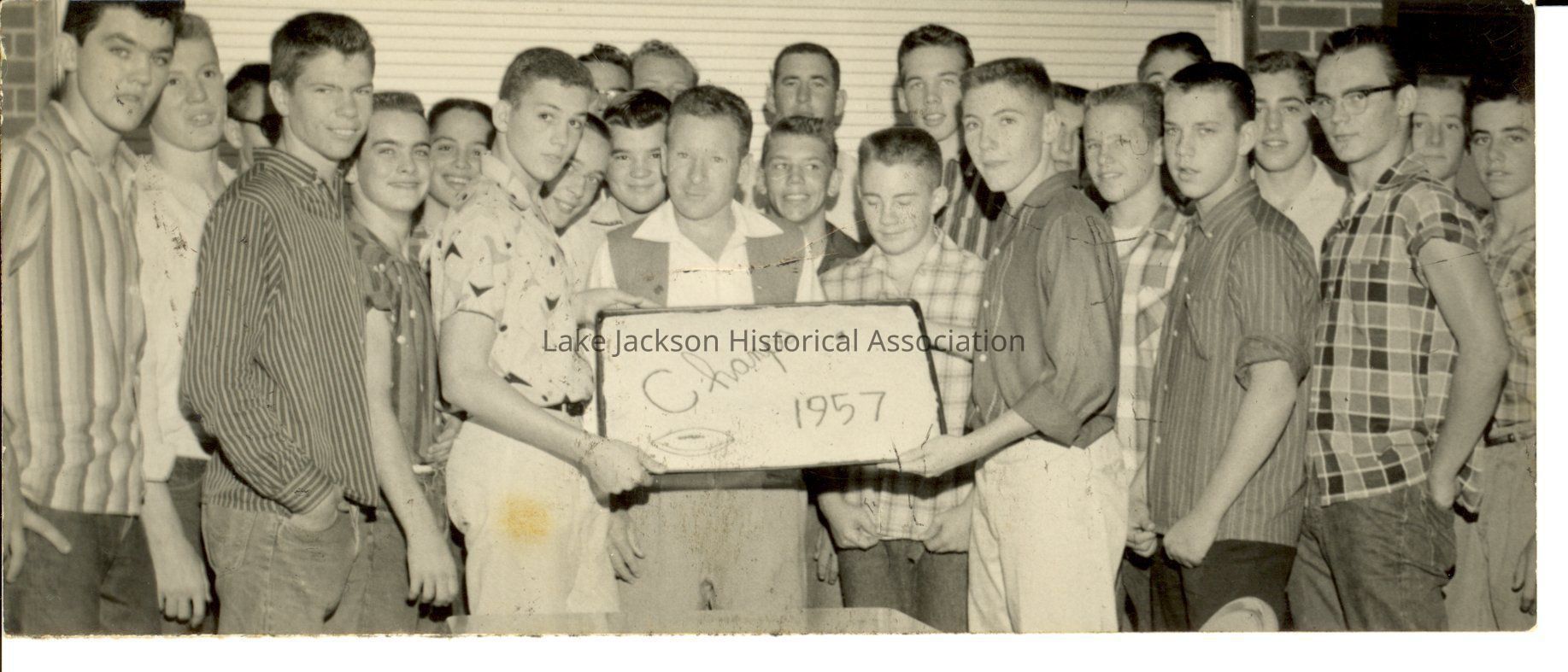 Black and white photo of a group of boys holding a cake decorated with "Champs 1957"Collection