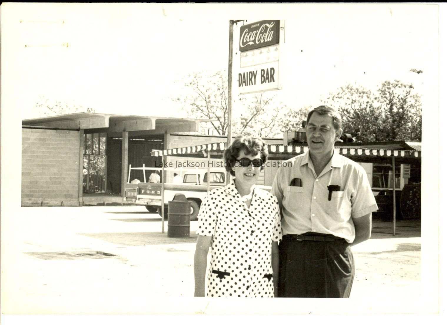 1- Black and white photo of Ernest "Slim" Harnden, owner of Dairy Bar, and wife Dorothy Lee standing in front of the newly constructed restaurant in the 1970s. The original Dairy Bar was a wood-frame building that opened in 1951.Collection