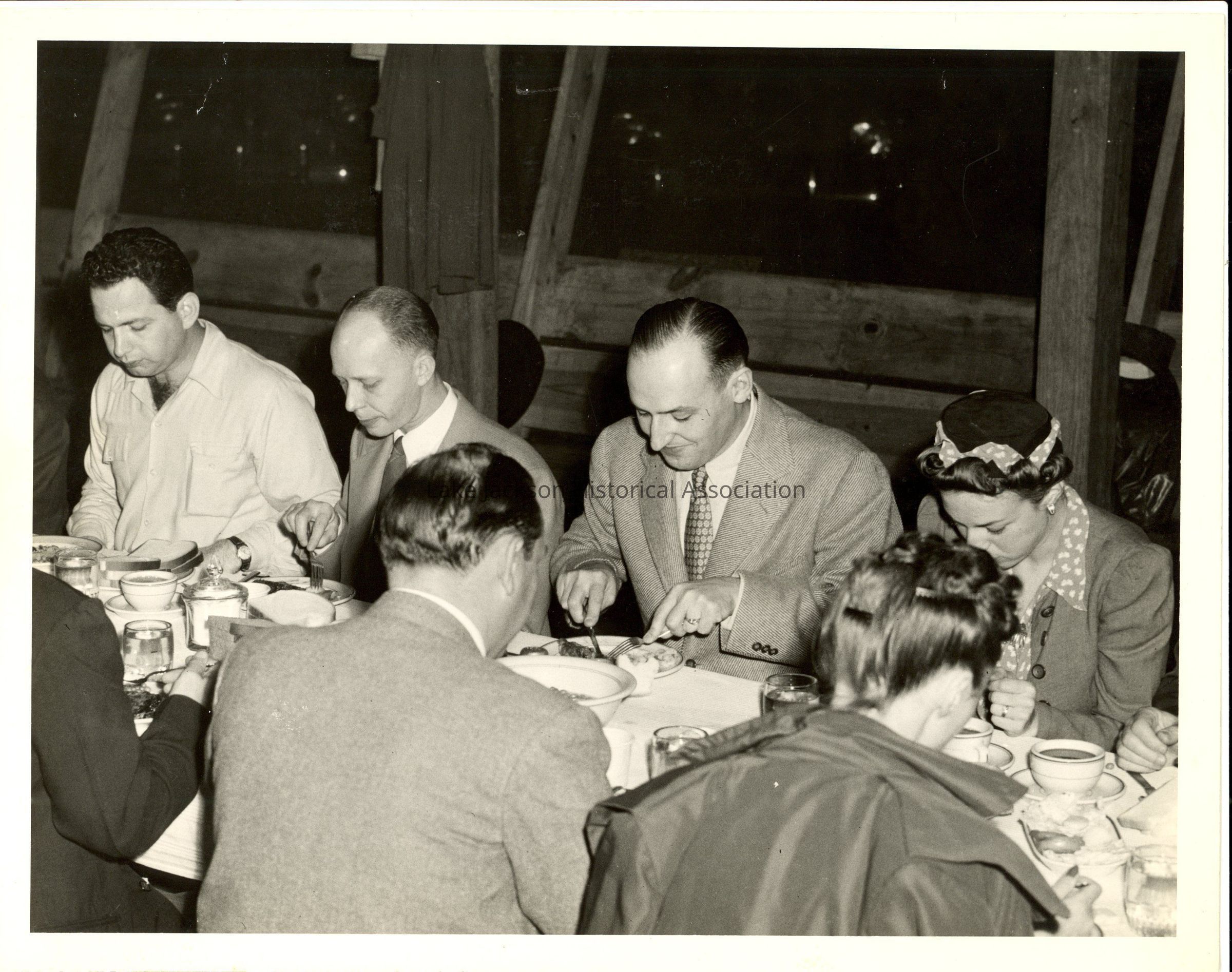 1- Black and white photo of a group of people at a dinner party. Looks like it could have been at the pavilion at Dow Park.Collection