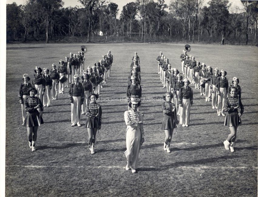 Black and white photograph of Lake Jackson Junior High School band posed in uniforms on the football field. They are in formation.