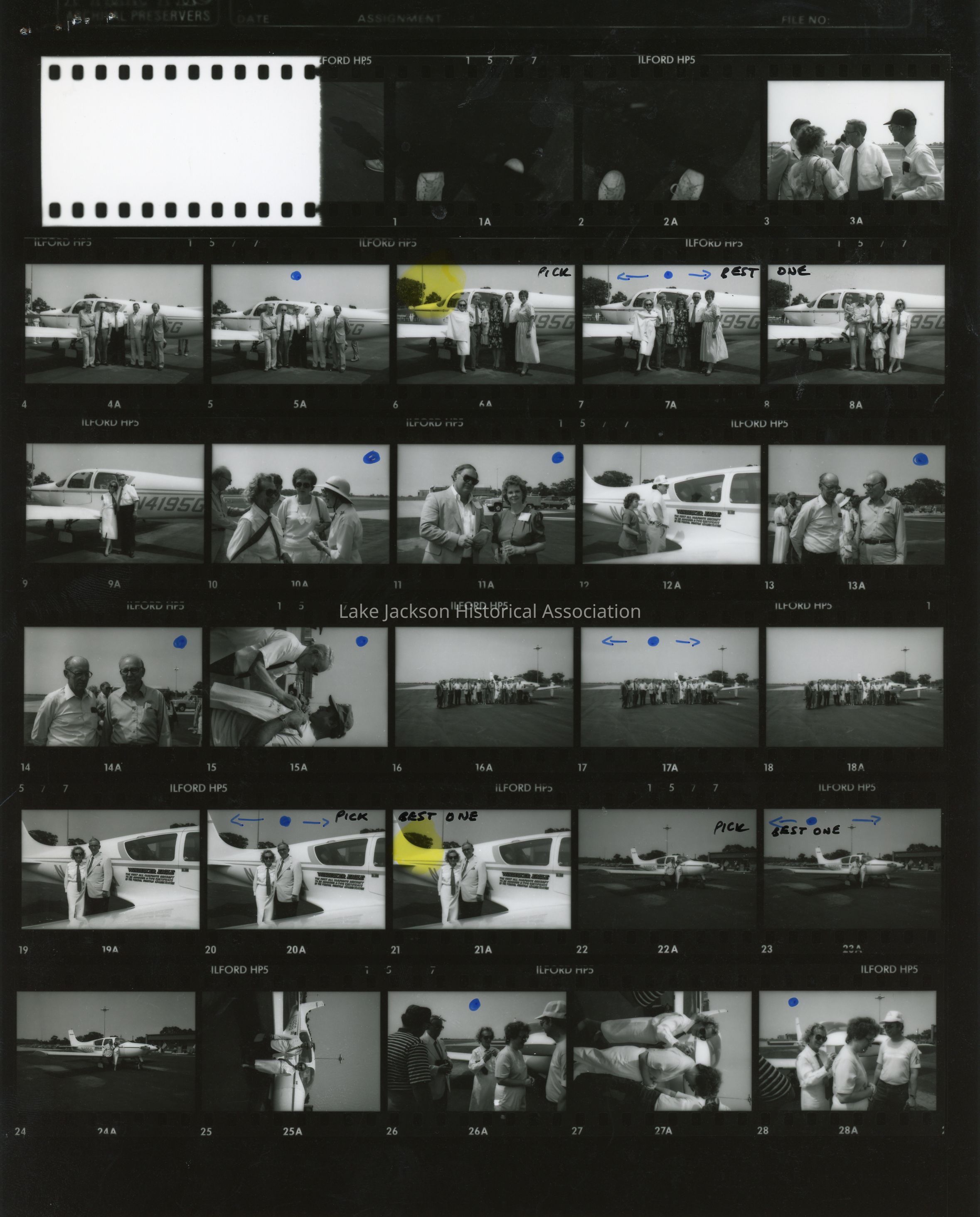 Black and white photocopy of a sheet of negatives with various photographs taken during the donation of the Windecker Eagle (N4195G) to the Lake Jackson Historical Association held at the Brazoria County Airport.Collection