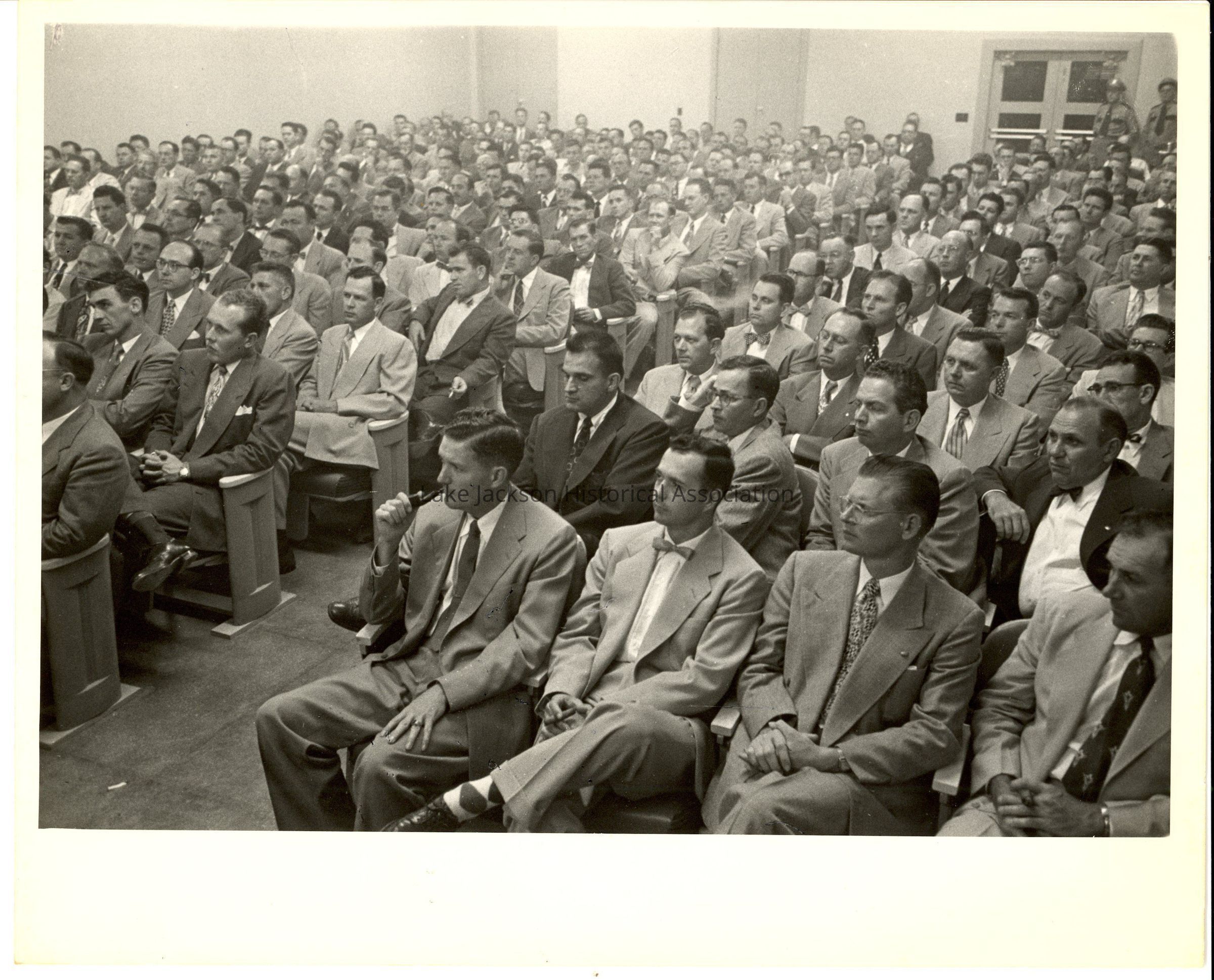 Black and white photo of a theater style room full of seated men.Collection