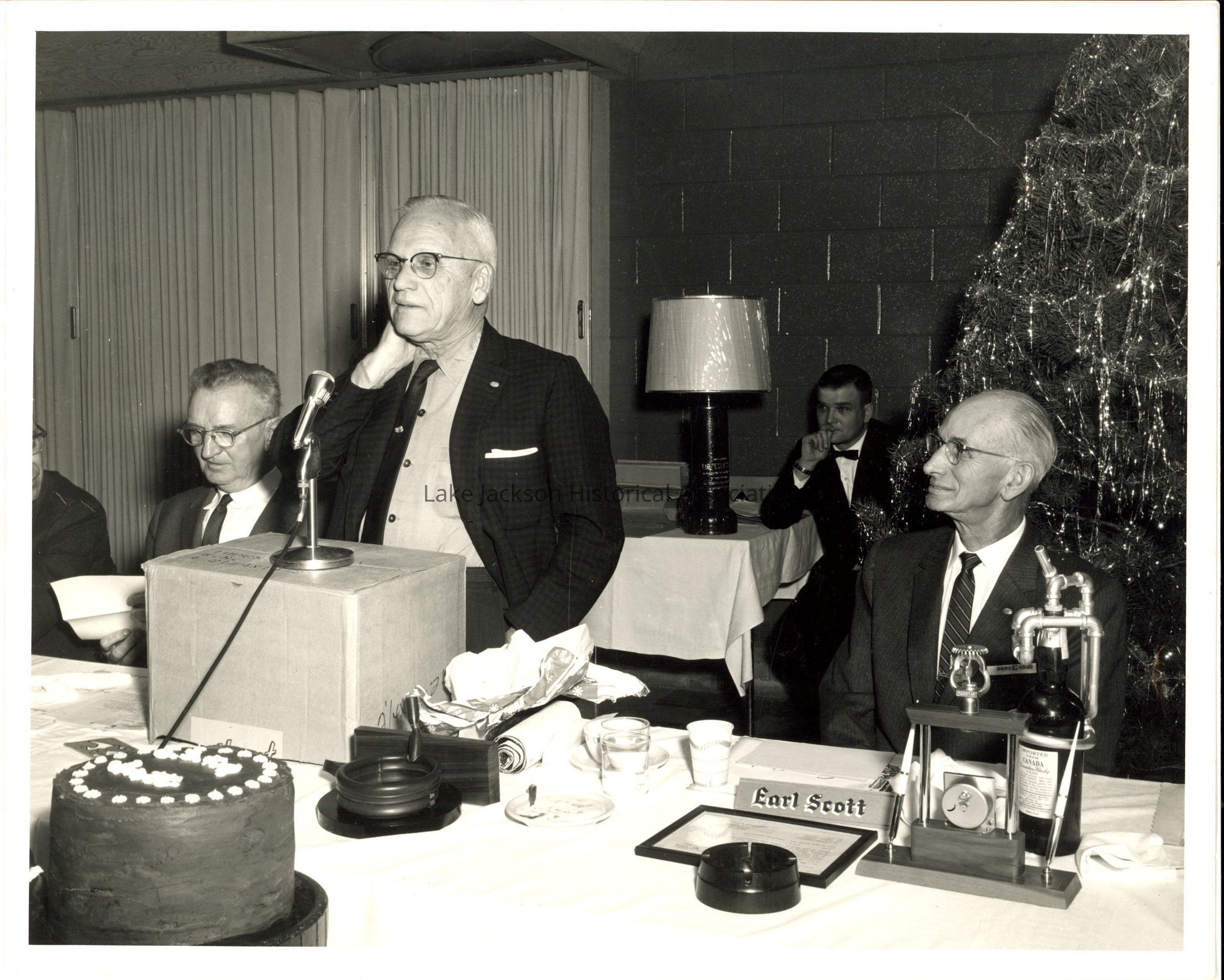 1- Black and white photo of Dr. Beutel at the microphone while other men listen. A Christmas tree is in the background, and a cake is on the table in front of Dr. Beutel.Collection