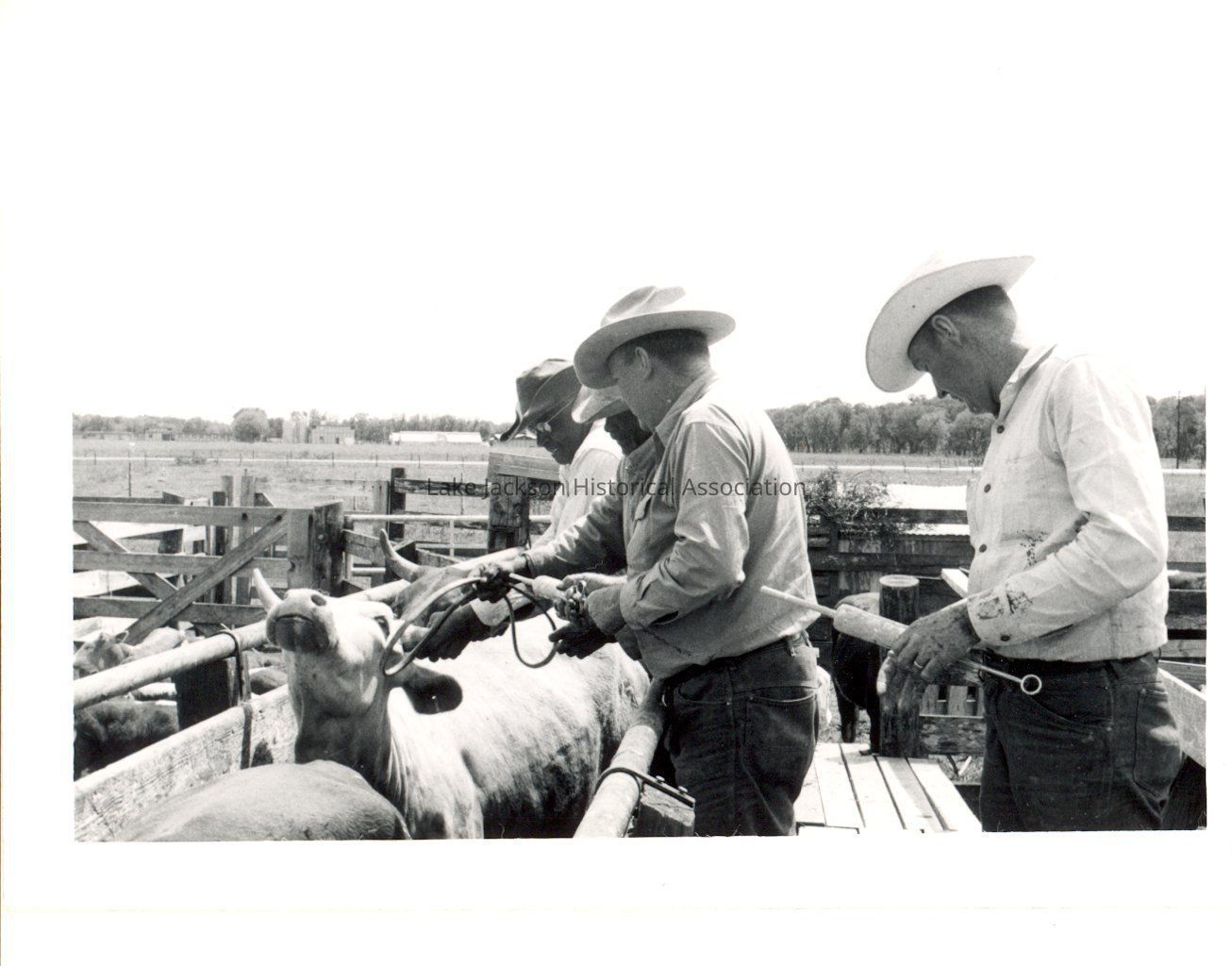 1- Black and white photo of three cowboys tending to cattle in a pen.Collection