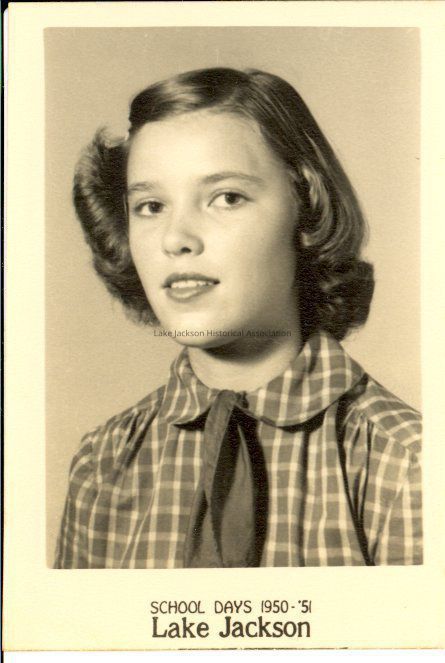 Black and white school picture of Marilyn Newsom. The name is from an enclosed guide sheet. At the bottom center is the caption "School Days 1950-'51 / Lake Jackson".Collection