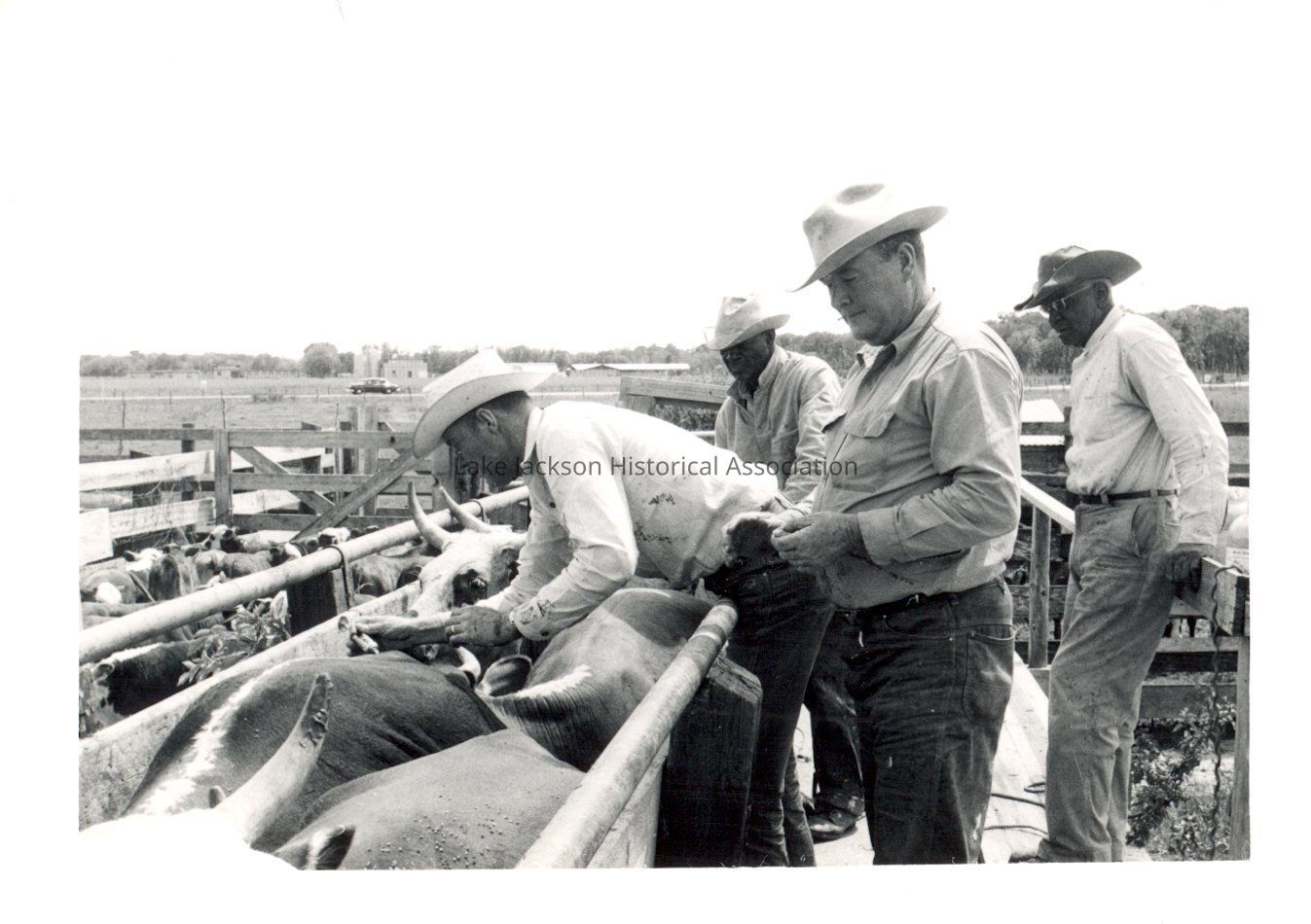 1- Black and white photo of four cowboys tending to cattle in a pen.Collection