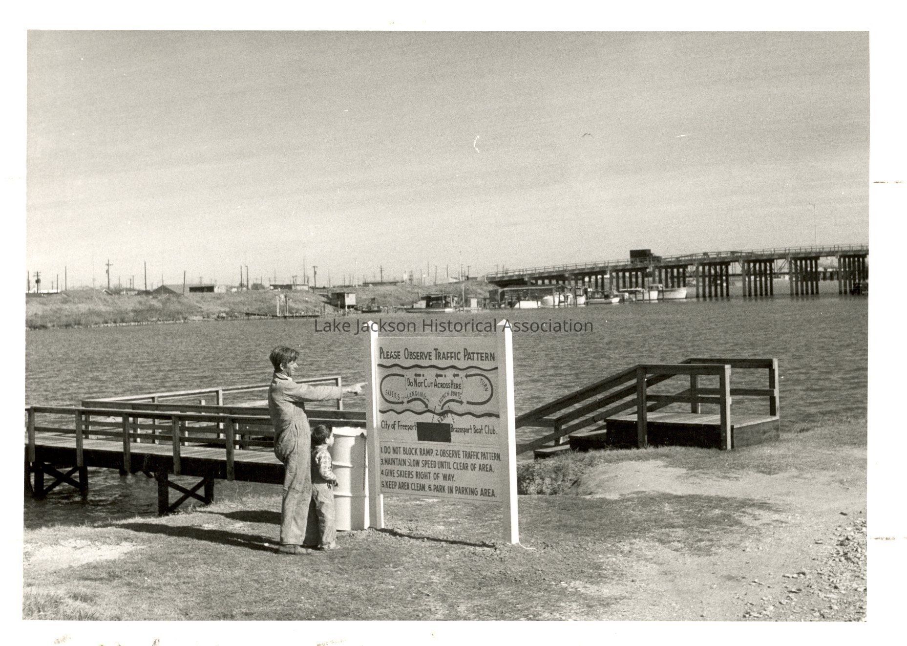 Black-and-white photograph of an unidentified man and child standing next to the entrance sign for the Brazosport Boat Club. Date unknown.Collection