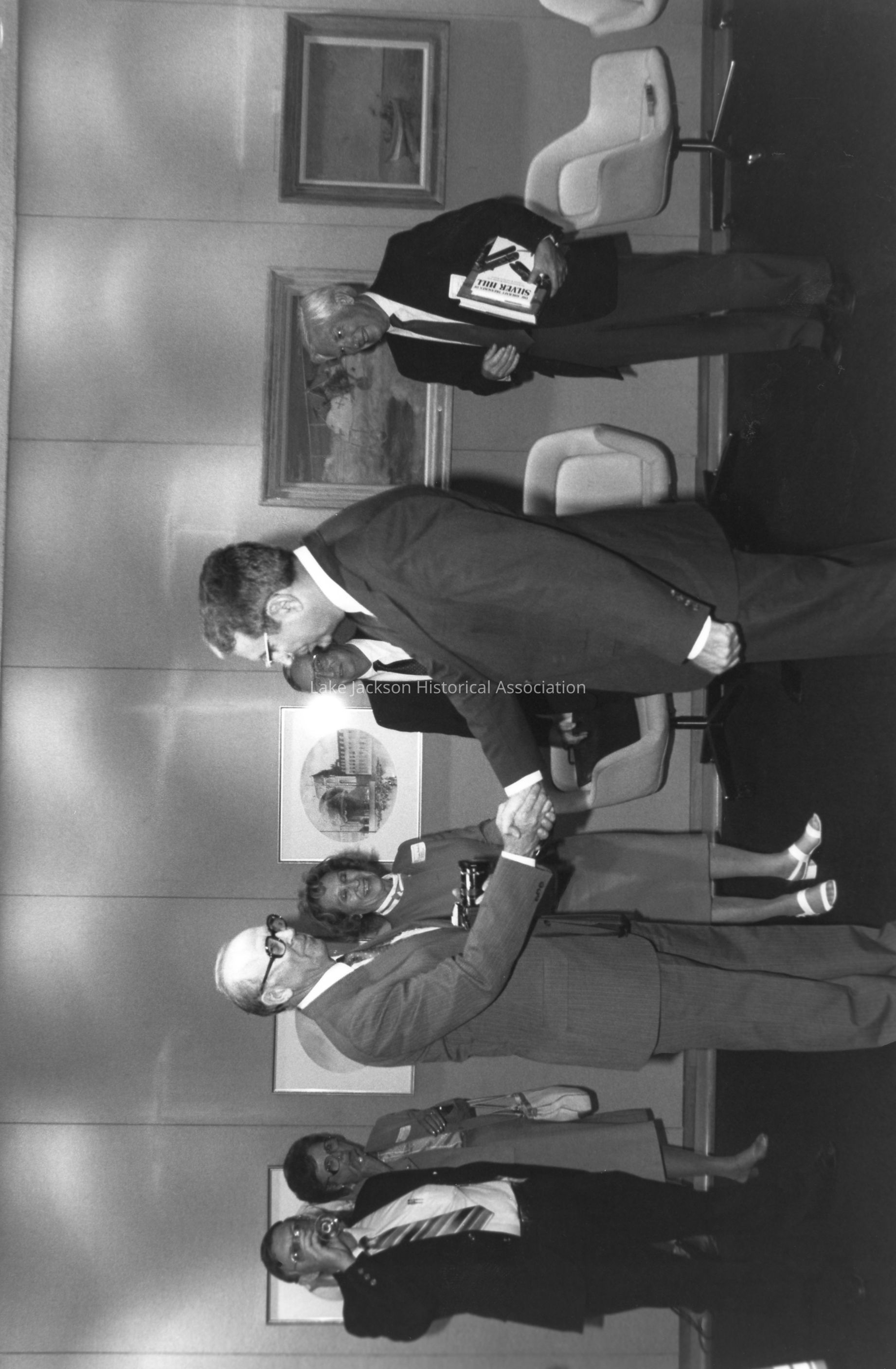 1- Black and white photo of a group of people ( 2 men) shaking hands. Dated around 1985. Mac Pruitt on the left, shaking hands with ? . In the background between the men are Fairfax Windecker and Leo Windecker. Written in the lower right corner in black ink is "N A&S M." On the back at the right side ,in blue ink is "85-11221-14".Collection