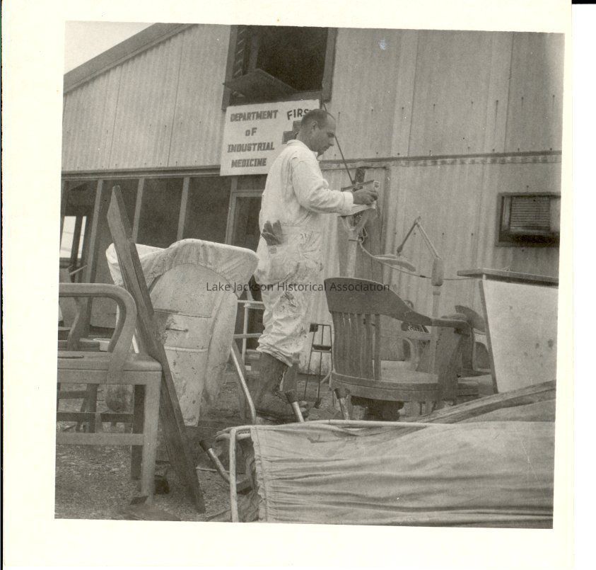 A small black and white picture of some destruction after Hurricane Carla. Back of photo reads: "J. O. Chamberlain; Industrial Medicine".Collection
