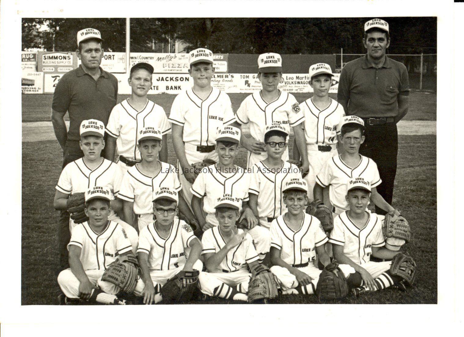 Black and white photo of Pete Richards' ball team. Pete Richards is the coach on the left.Collection