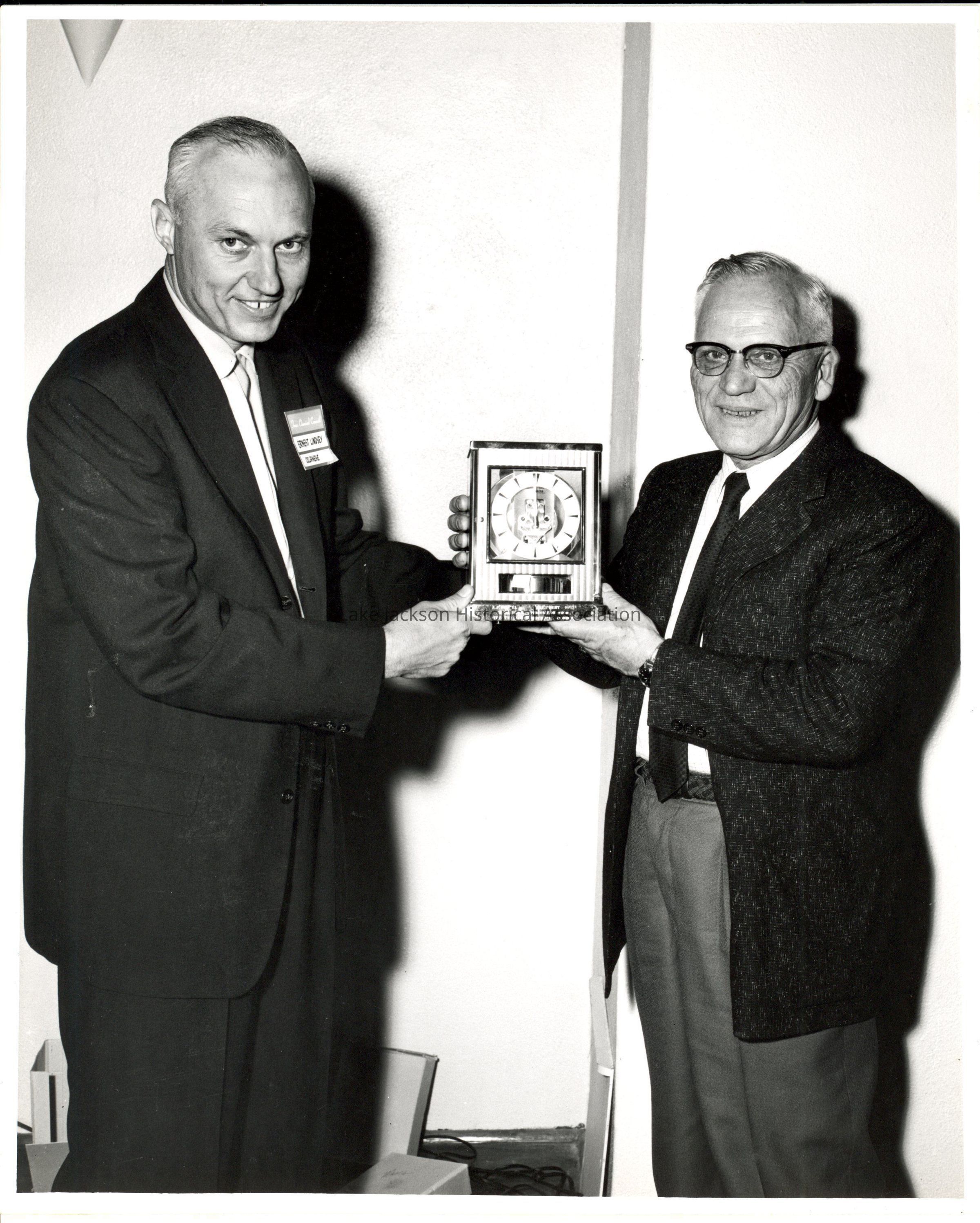 1- Black and white photo of Dr. Beutel receiving a plaque from Earnest Lindsey, Celanese- Texas Chemical Council.Collection
