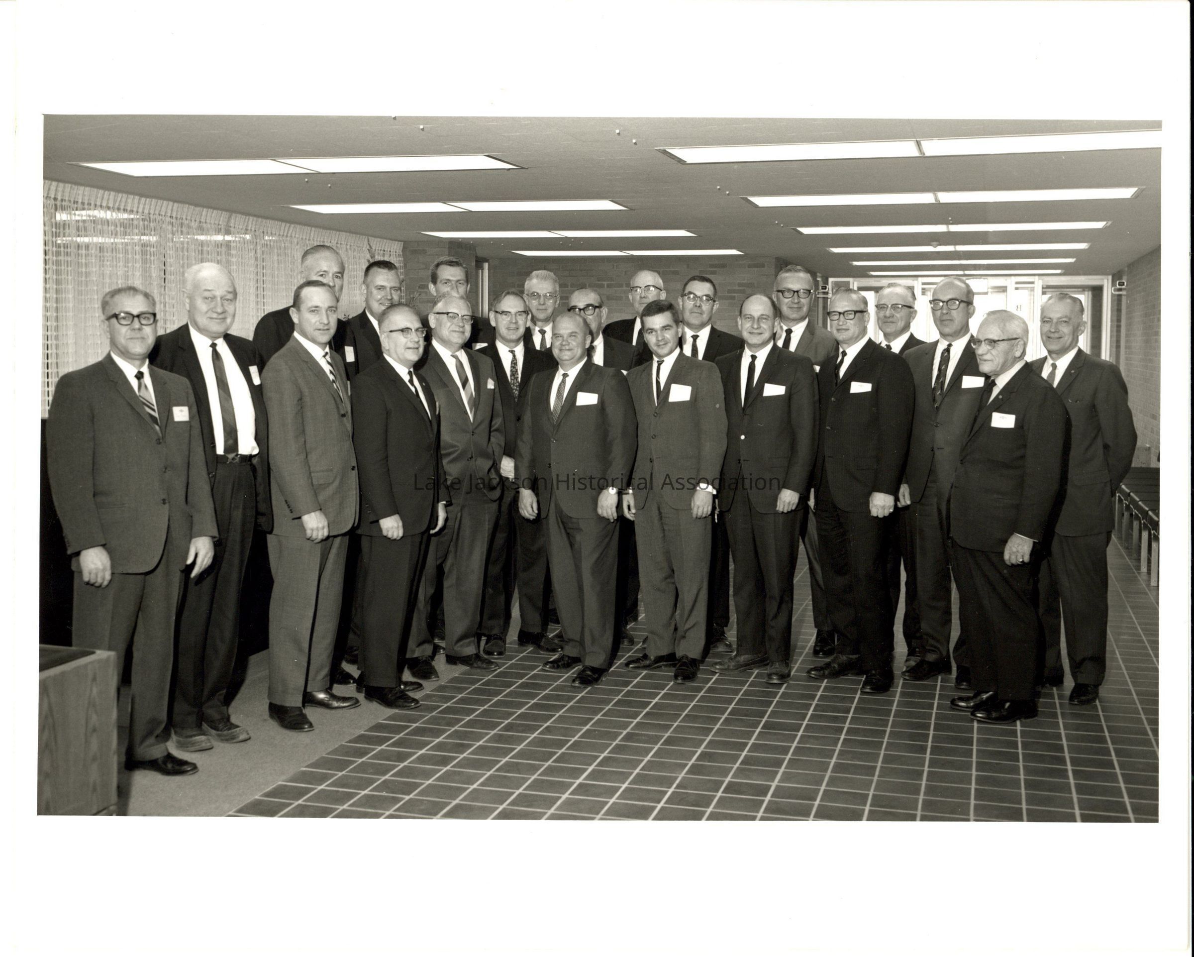Black and white photo of 22 men standing in a building lobby. Dr. Beutel is in the far right of the picture.Collection