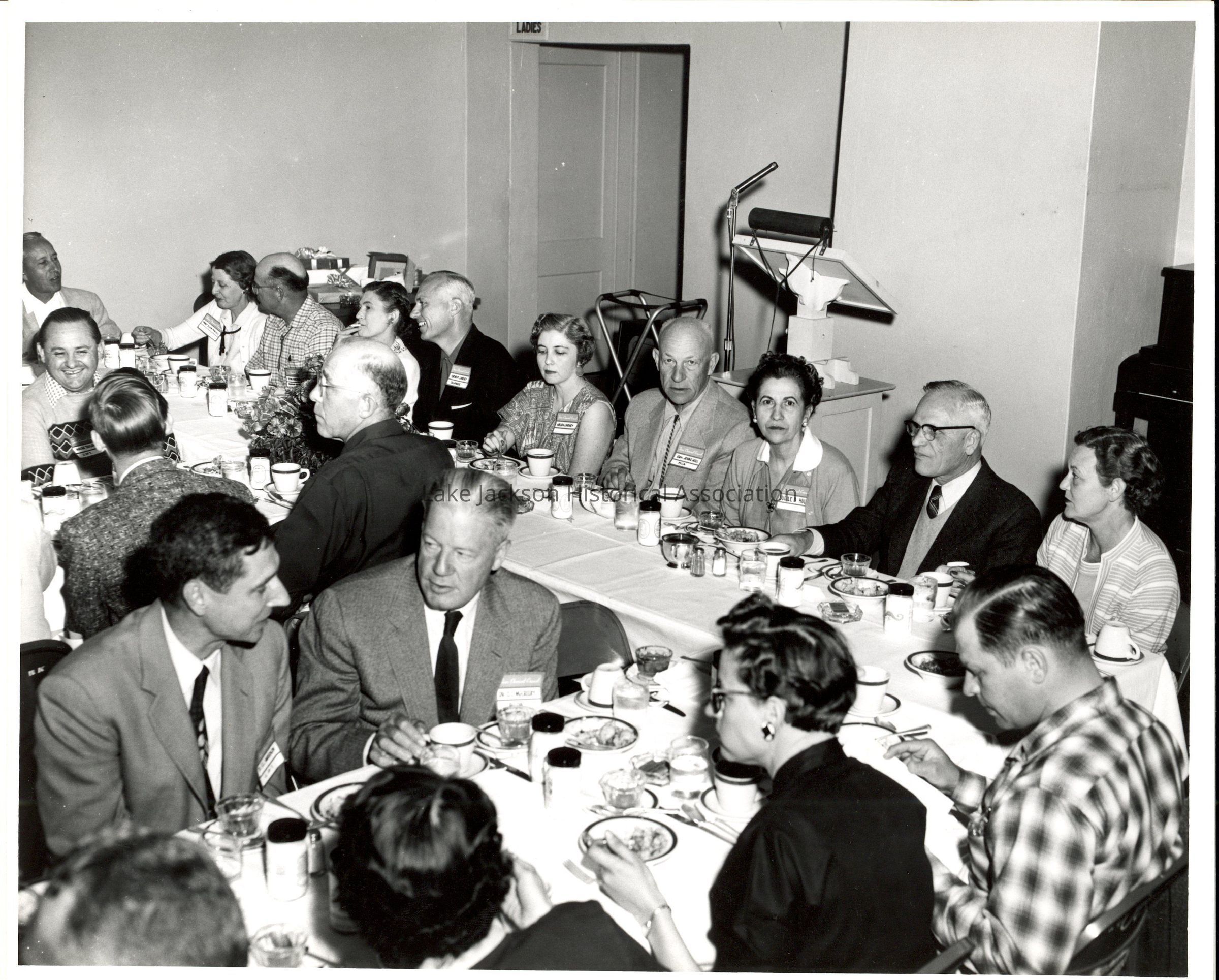 1- Black and white photo of a group of people at a dinner party of the Texas Chemical Council with Dr. Beutel. Earnest Lindsey is on the left with a dark coat on.Collection