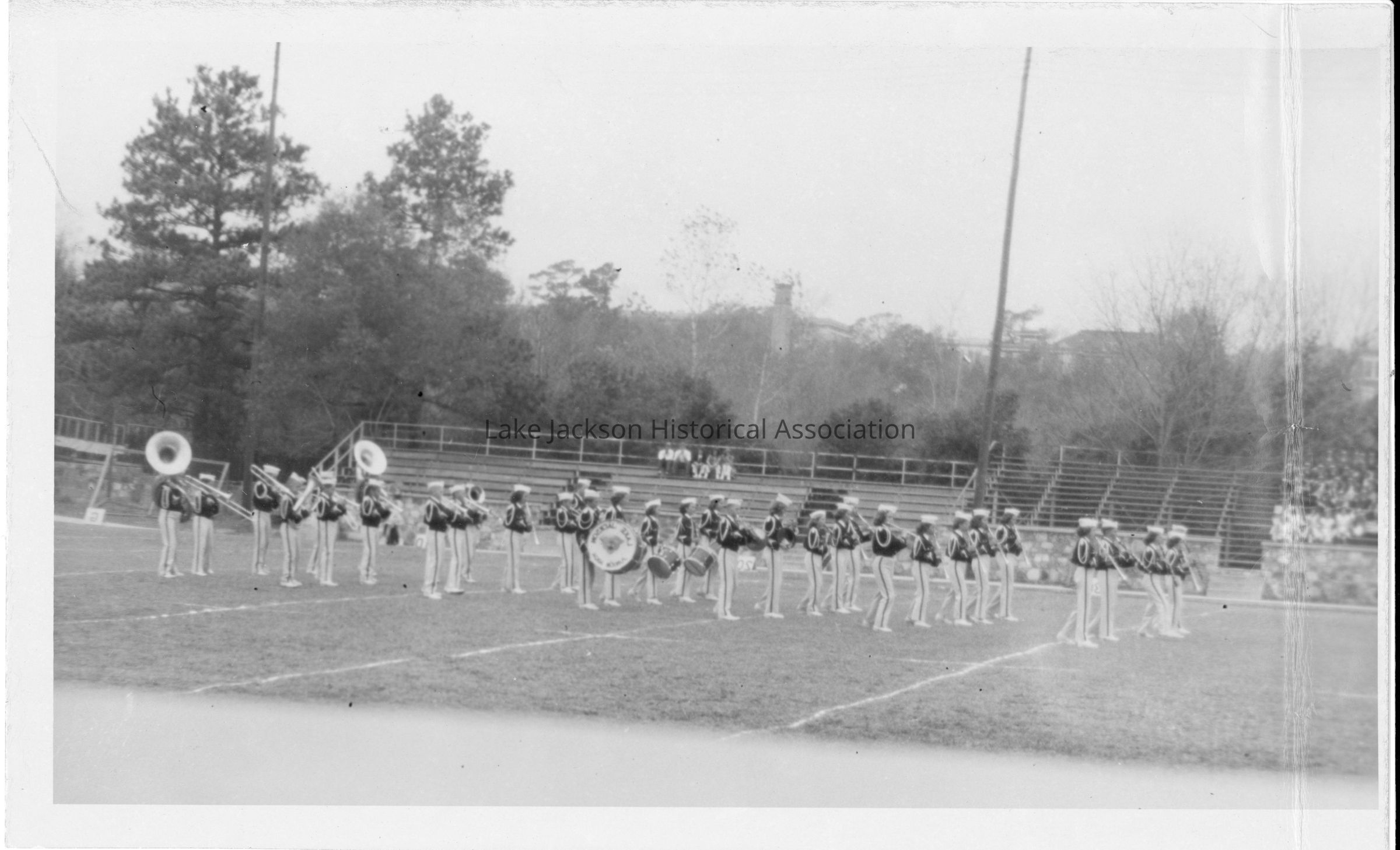 Black and white picture of the band marching on the field. There are a few spectators in the stands.Collection