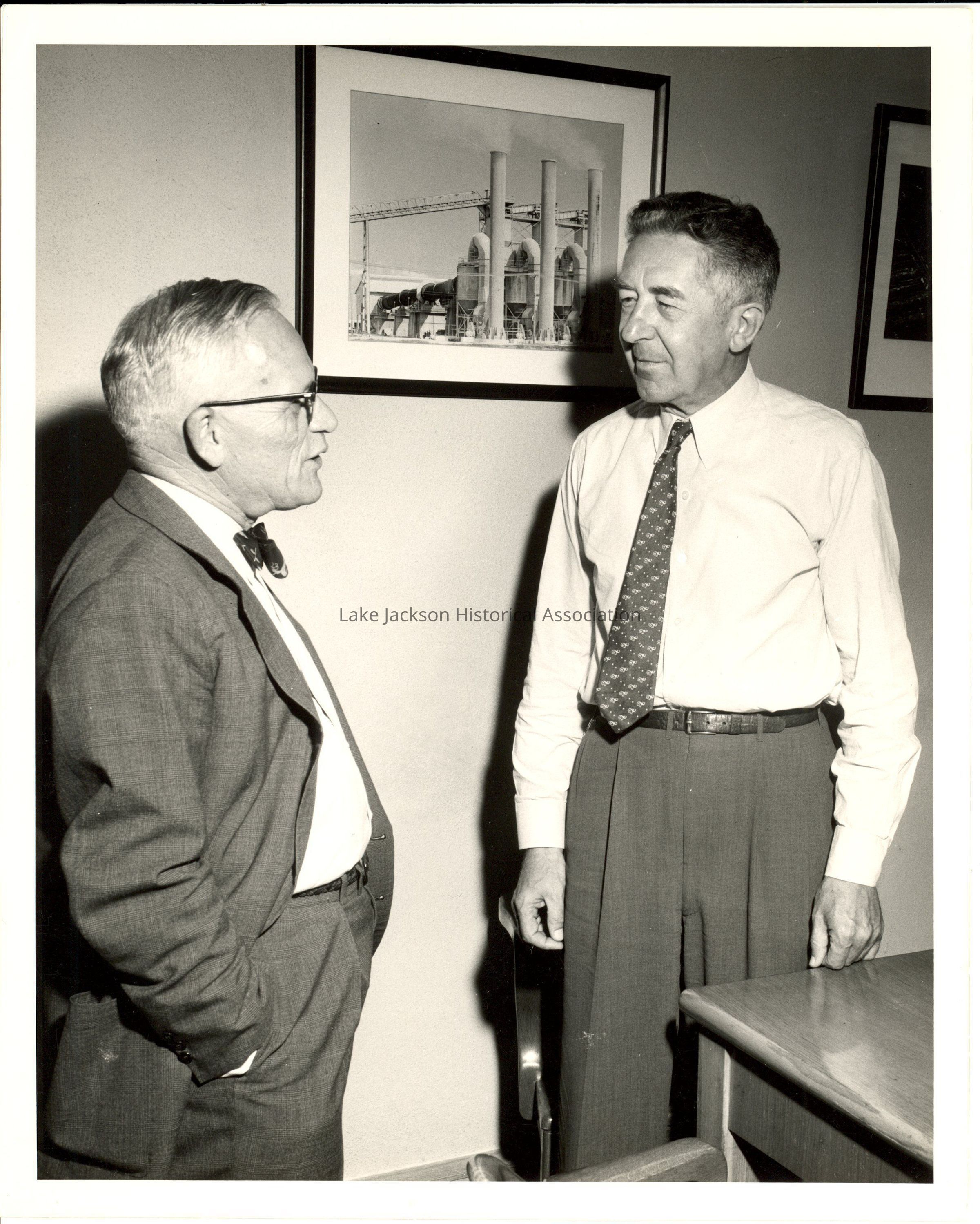 1- Black and white photo of Dr. Beutel talking to another man. They are standing in front of a picture of a chemical plant hanging on the wall.Collection