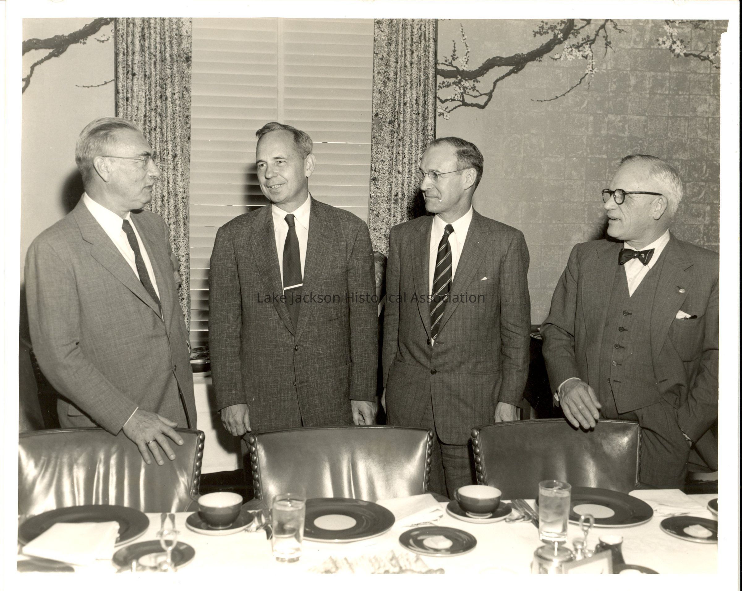 1- Black and white photo of Dr. Beutel with three other men standing behind a dining table. Left to right: Dr. Debye, Dr. Eyring, Dr. King, and Dr. Beutel. Nov. 19, 1954.Collection