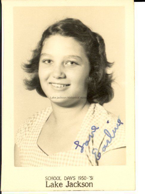 Black and white school picture of Earline Perkins (?). The picture is signed in blue ink, "Love Earline". Last name obtained from the list of band students 1950-51, object ID 2003.12.42. At the bottom center is the caption "School Days 1950-'51 / Lake Jackson".Collection