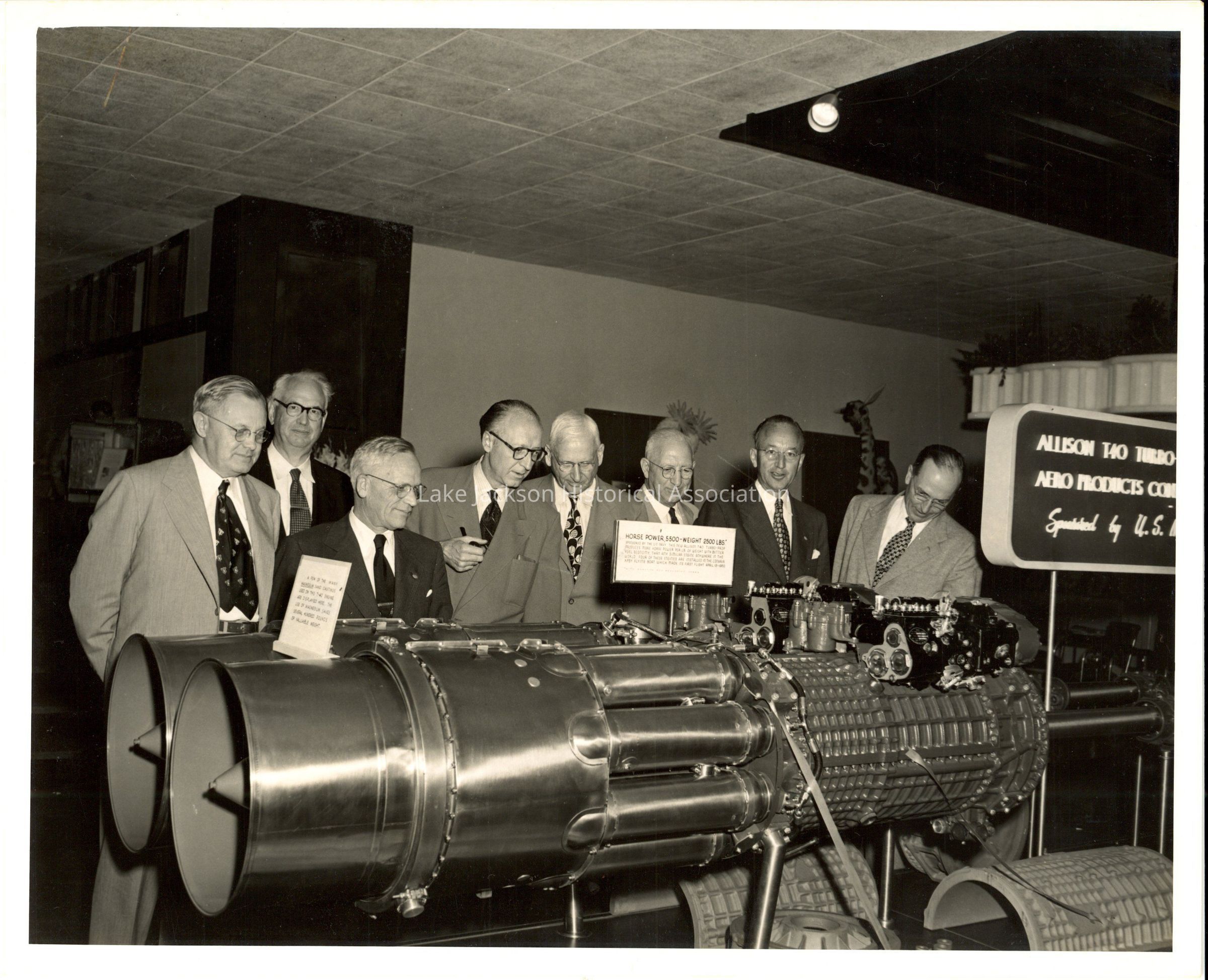 1- Black and white photo of a group of men with Dr. Beutel looking over an engine. This was the annual stockholders meeting on August 23, 1958. The engine's horsepower is 5500- weight is 2500 lbs. Sponsored by the U.S. Navy, this T-40 Turbo Prop produces more horsepower per lb. of weight with better fuel economy than any similar engine anywhere in the world. Four of these engines are installed in the Convair XP5Y flying boat, which made its first flight on April 15, 1950.Collection