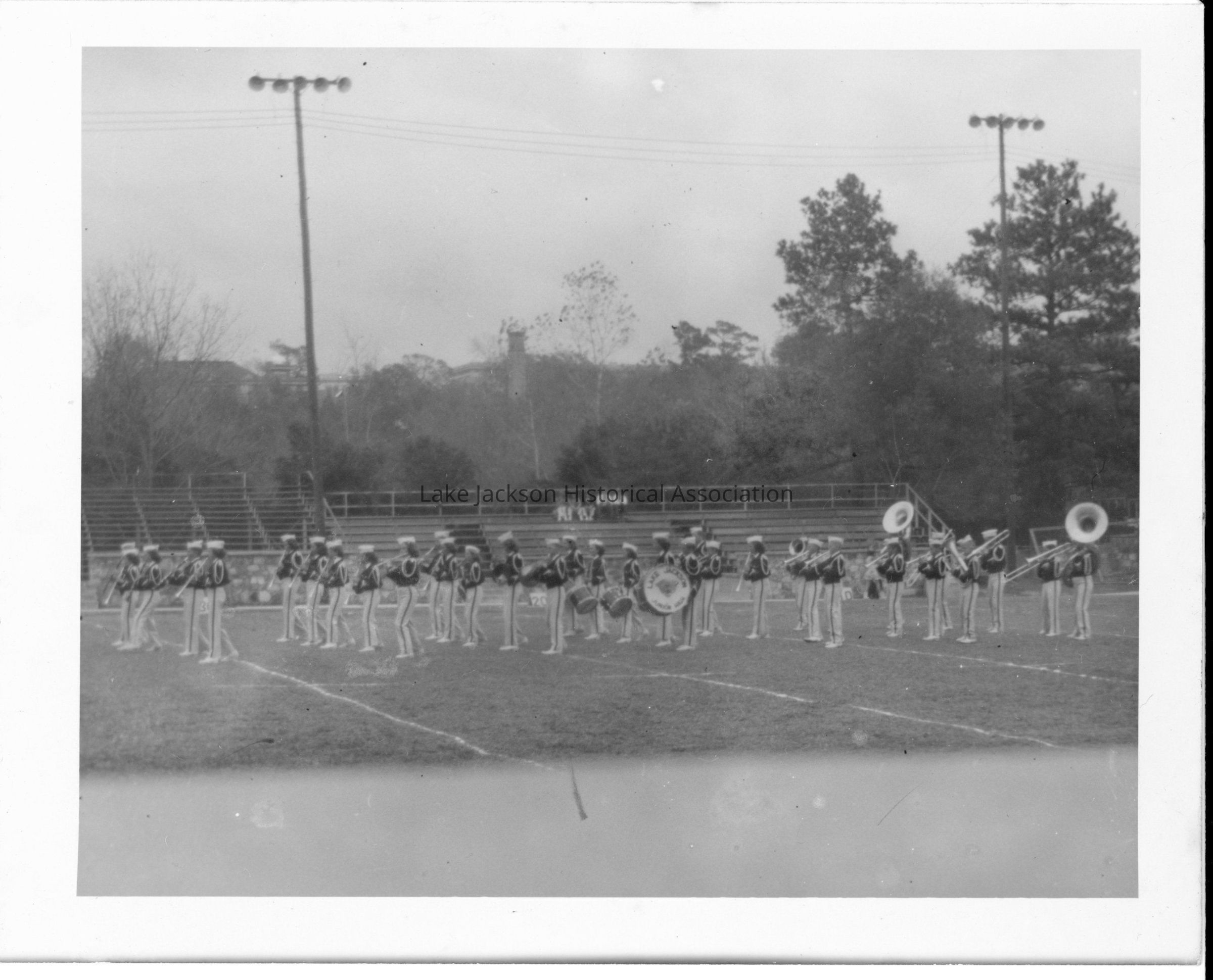 Black and white picture of the band marching on the field. There are a few spectators in the stands.Collection