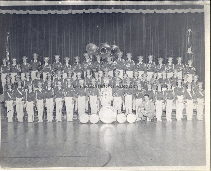 Black and white photograph of the Lake Jackson Junior High School band standing in the gym/stage. Grant Scoggins is kneeling in front. The picture appears to be slightly overexposed.