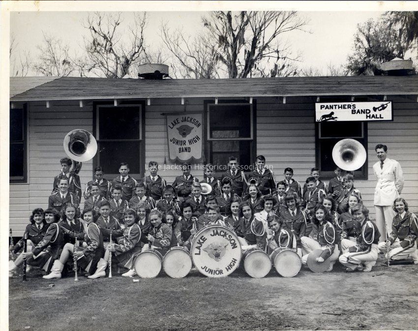 Black and white photograph of Lake Jackson Junior High School band posed in uniforms outside "Panther's Band Hall".
