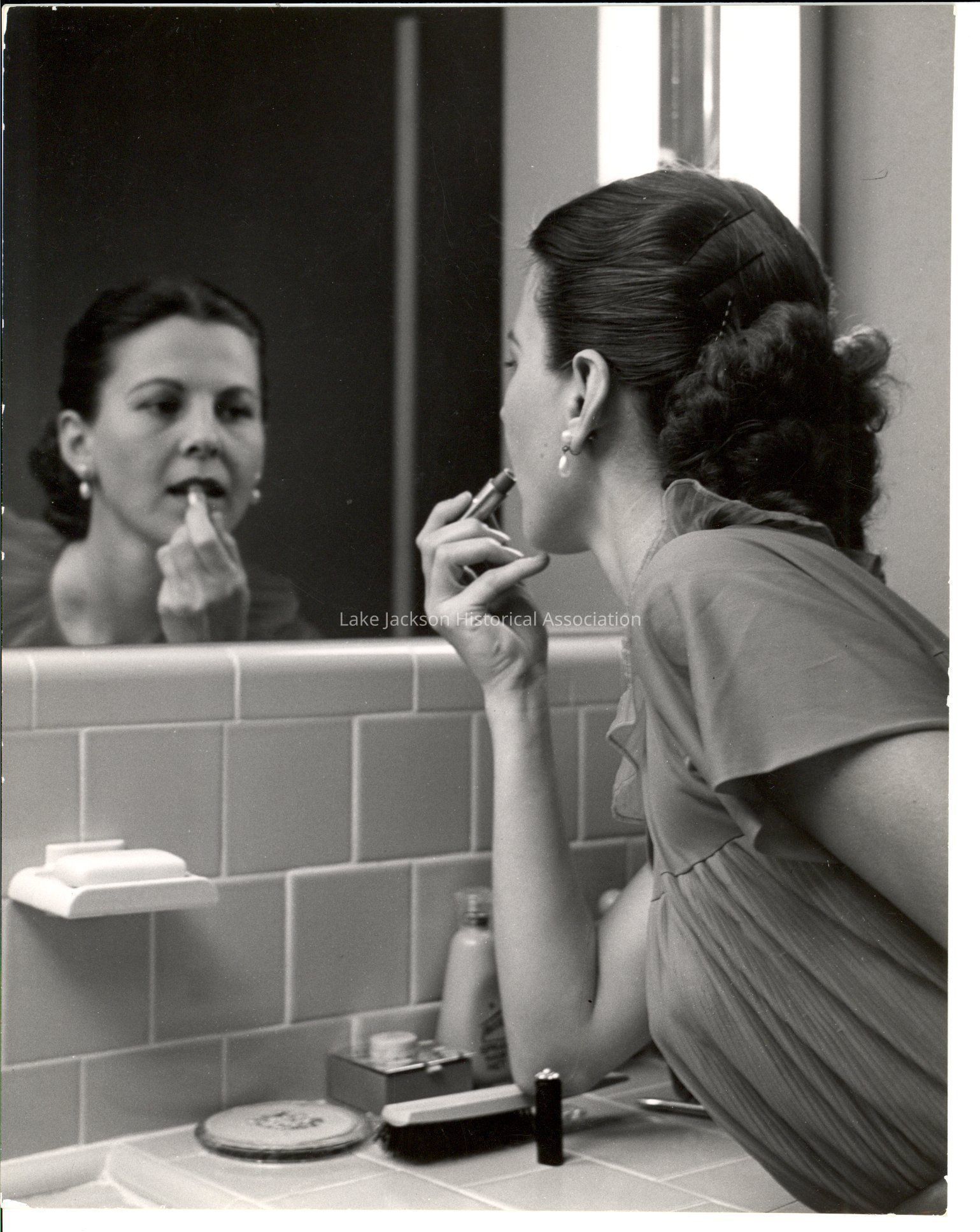 A black & white photo of a woman looking into a bathroom mirror and putting on makeup.Collection