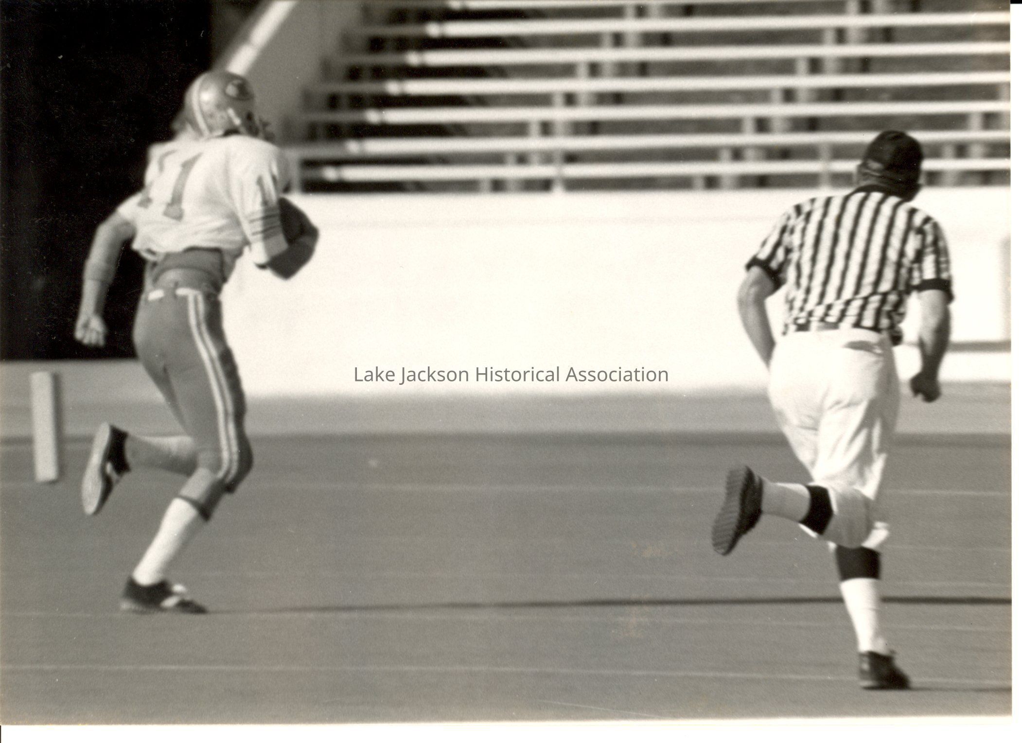 Black and white photo of a football player running with the ball and an official.Collection