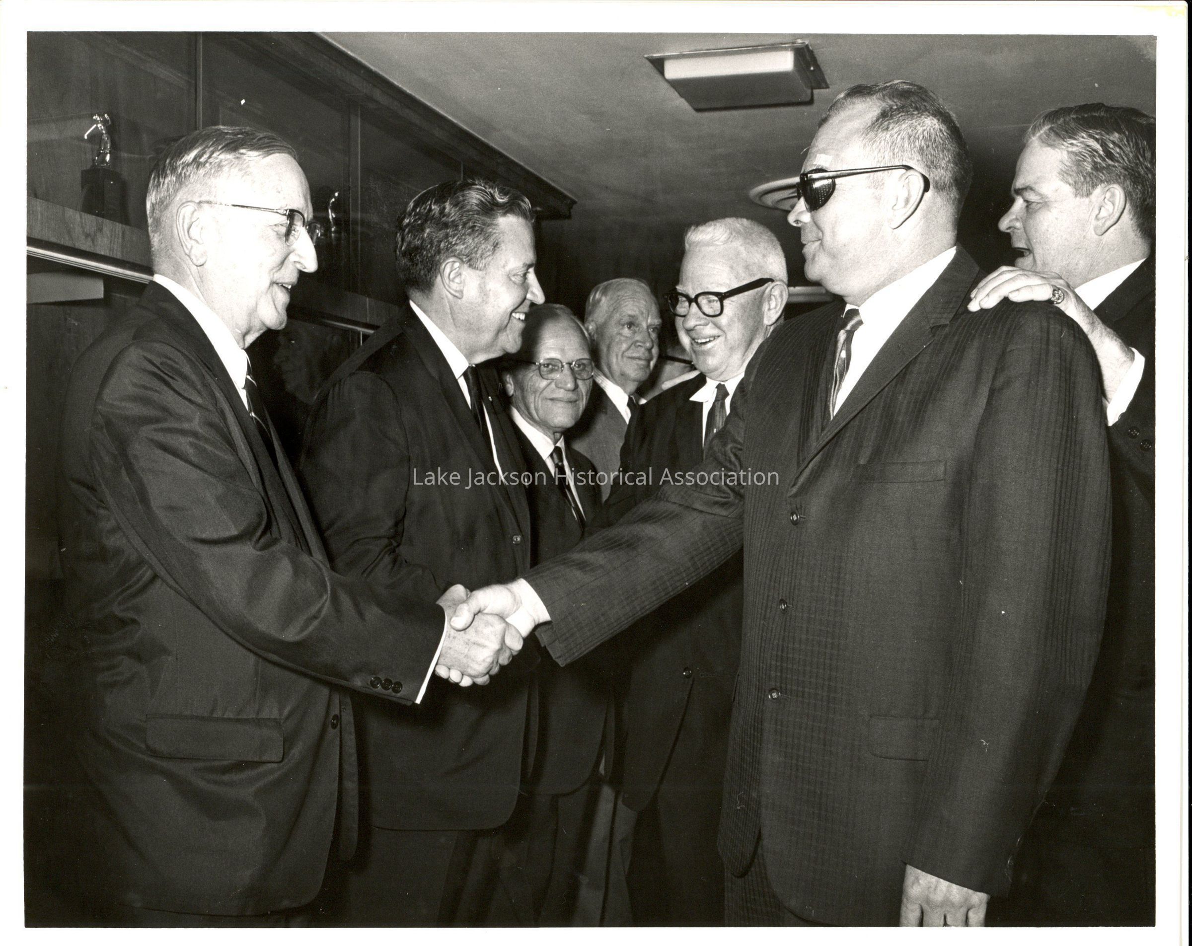 1- Black and white photo of two men shaking hands and a group of men looking on. Dr. Beutel is in the center.Collection