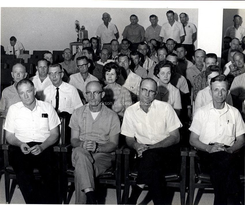 Black and white photograph of a group of employees. It appears to be the left side of a group photo. See 2003.7.40 for the right side.