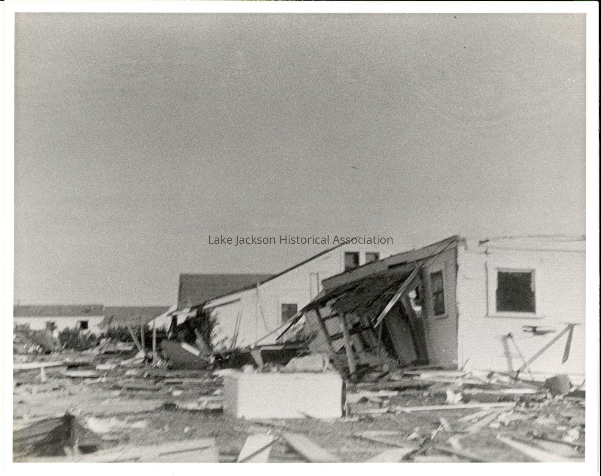 B/W Photo of the 1943 Freeport Tornado. A view of several damaged buildings.Collection