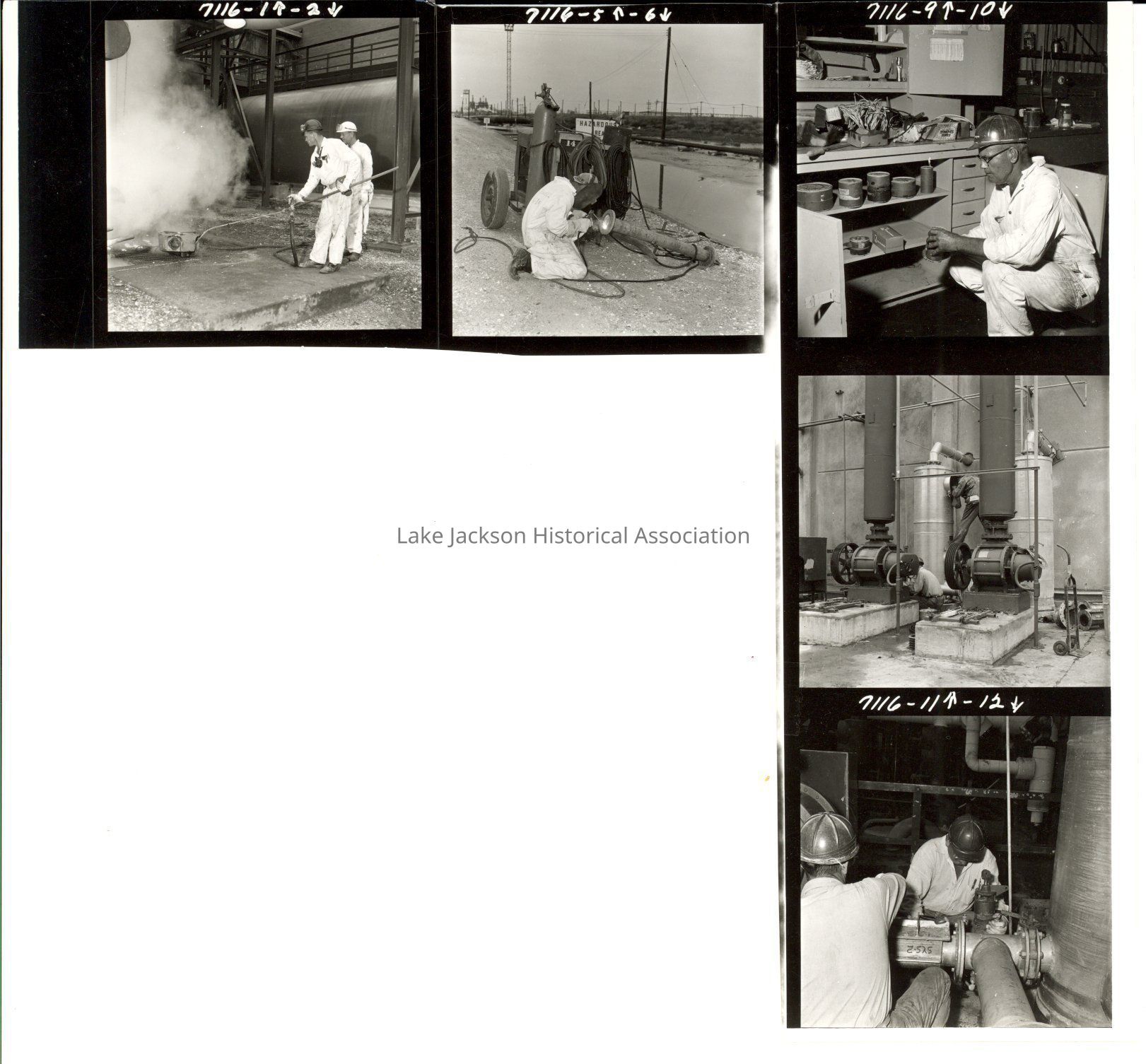 A strip of 5 black and white photo proofs in an "L" shape. They are pictures of what appears to be clean up in the Dow Plants after flooding from Hurricane Carla .Collection