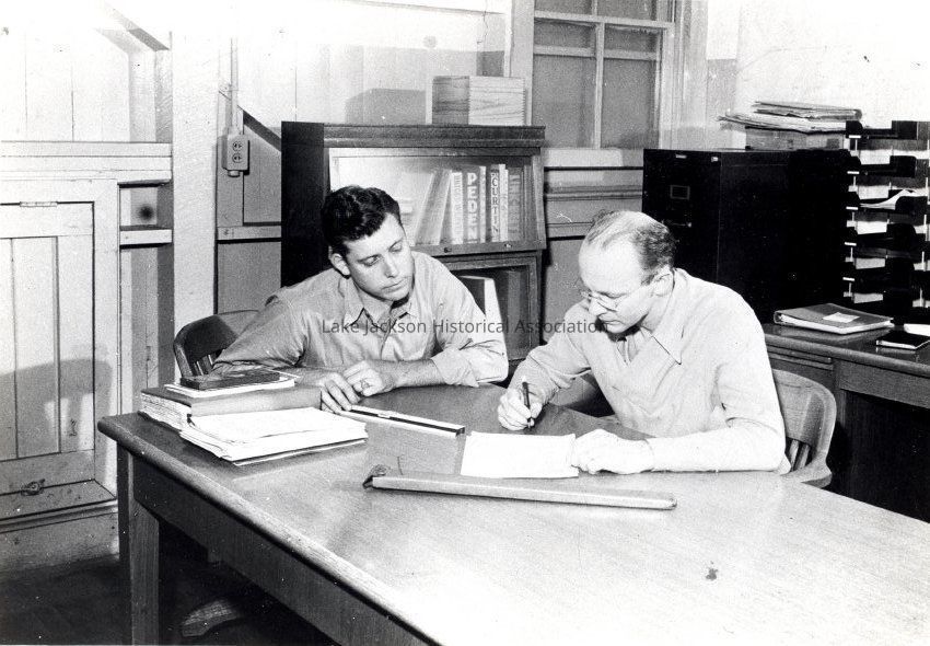 Black and white photograph of two men seated at a table doing calculations with a slide rule. No date is given. The men are not identified.Collection